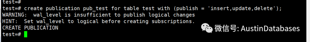create publication pub_test for table test with (publish = 'insert,update,delete');