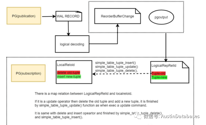 逻辑复制采用的复制的方式和我们的物理的复制方式是不同的,采用的方式是通过逻辑的模块对WAL 日志进行解析,并且将结果存储为堆表的数据,并将这些数据通过pgoutput plugin 将这些结果进行过滤(对于数据DML操作进行过滤)。