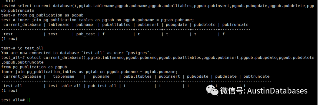 select current_database(),pgtab.tablename,pgpub.pubname,pgpub.puballtables,pgpub.pubinsert,pgpub.pubupdate,pgpub.pubdelete,pgpub.pubtruncate