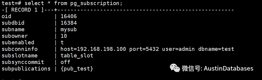 select * from pg_subscription; 通过 pg_subscription 来监控当前数据库中创建的 subscription