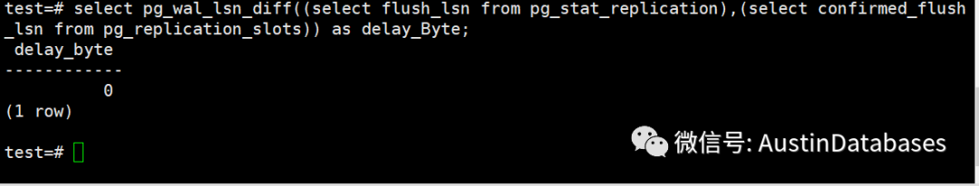 Byte select pg_wal_lsn_diff((select flush_lsn from pg_stat_replication),(select confirmed_flush_lsn from pg_replication_slots)) as delay_Byte;
