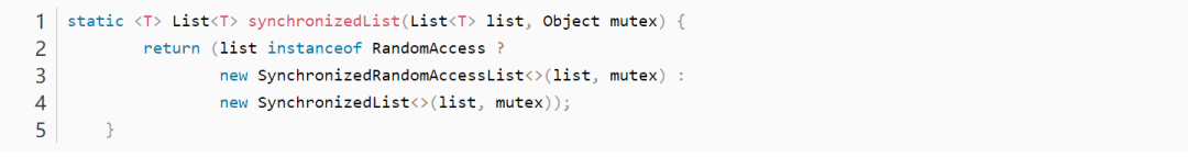 可以看到,将线程不安全的List转为线程安全的Collections.synchronizedList()方法,是通过生成SynchronizedList对象来实现的: