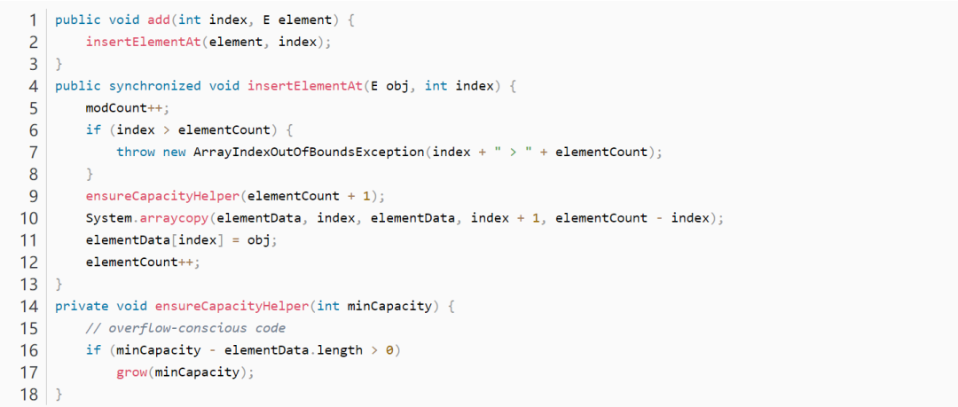 可以看到Vector的insertElementAt()方法使用了synchronized关键字来实现线程安全。其实Vector与ArrayList除了线程安全方面有所不同,两者之间的代码都很相似