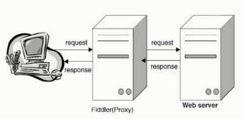 Fiddler 是强大的抓包工具,它的原理是以web代理服务器的形式进行工作的,使用的 代理地址是:127.0.0.1,端口默认为8888,我们也可以通过设置进行修改。代理就是在客户 端和服务器之间设置一道关卡,客户端先将请求数据发送出去后,代理服务器会将数据包进 行拦截,代理服务器再冒充客户端发送数据到服务器;同理,服务器将响应数据返回,代理服务器也会将数据拦截,再返回给客户端。其工作原理图如下图所示: