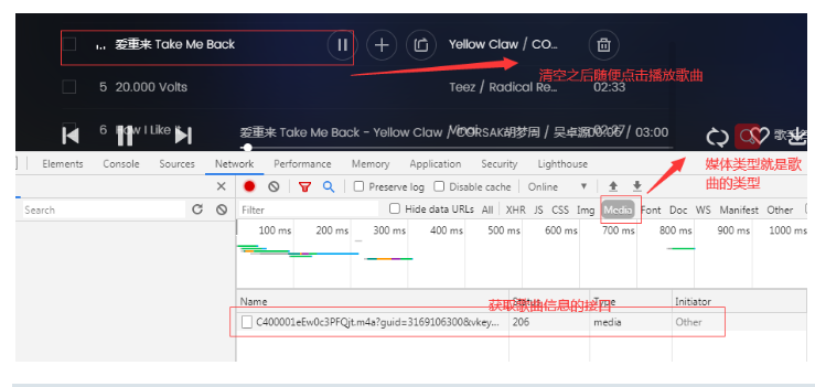 进入QQ音乐歌单点击播放,按F12打开开发者工具