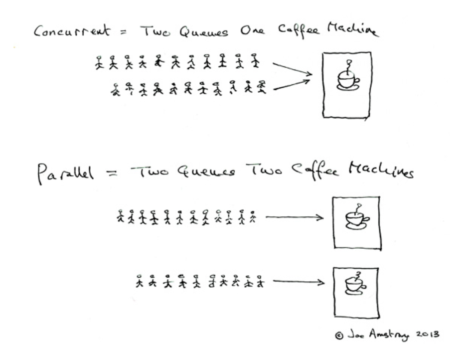 并发是两个队列交替使用一台咖啡机,并行是两个队列同时使用两台咖啡机,如果串行,一个队列使用一台咖啡机