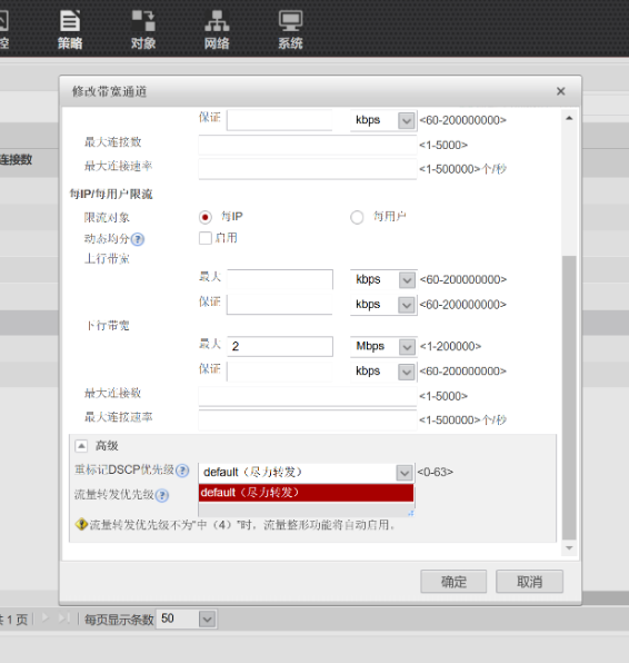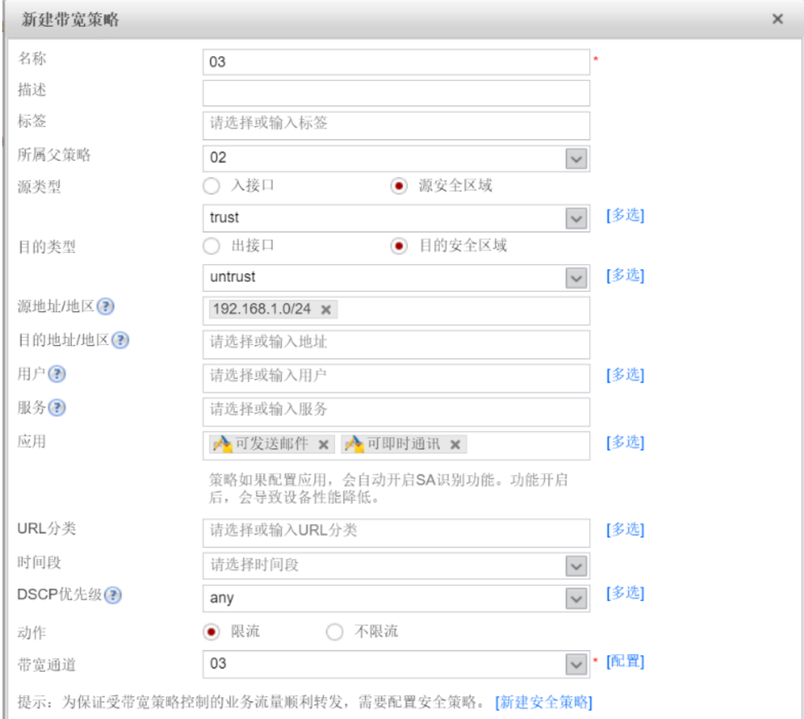 在最上面选择策略,左边选择带宽管理下的接口带宽,想让哪条通道的流量在拥塞状态下优先转发,就进入哪条通道,在通道最下面的高级设置里面有重点标记DSCP优先级,可在里面选择转发的顺序