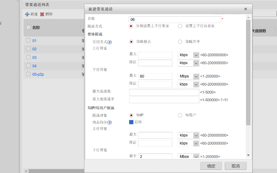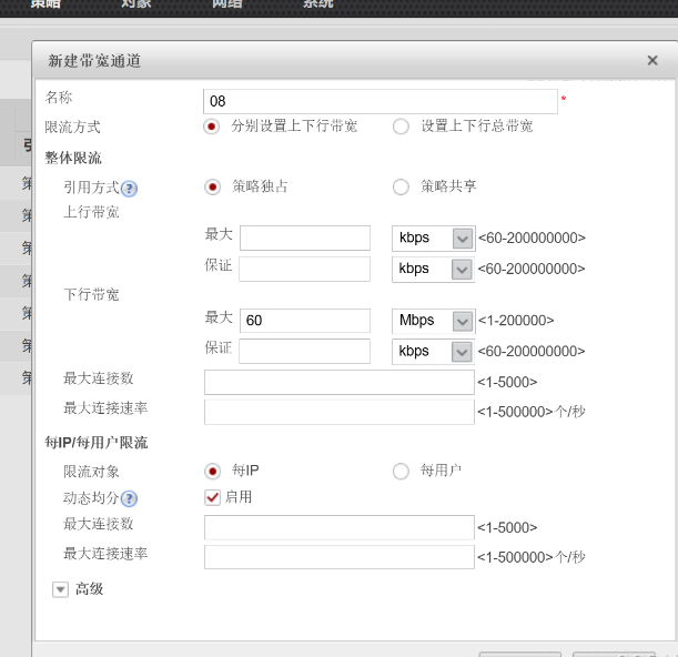 最上方命令选择策略,左方命令选择带宽管理下的带宽通道,在最上方命令的下下方选择新建,按要求新建06带宽通道,填写内容下行带宽带宽通保证通道60M,在限流对象选择每ip,下行带宽最大2mb