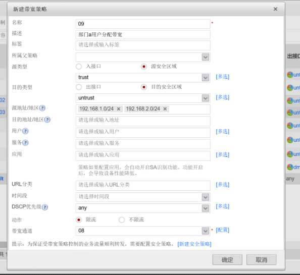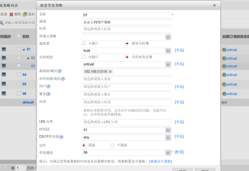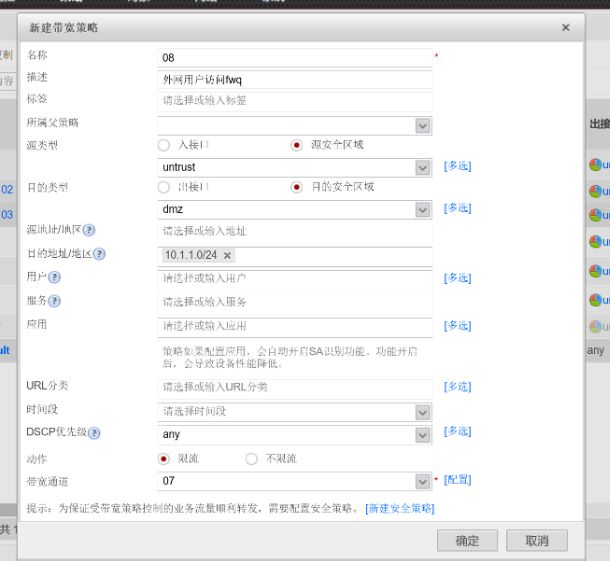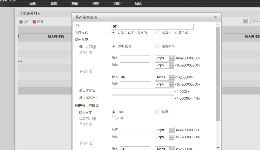 最上方命令选择策略,左方命令选择带宽管理下的带宽策略,在最上方命令的下下方选择新建,按要求新建07带宽策略,填写内容