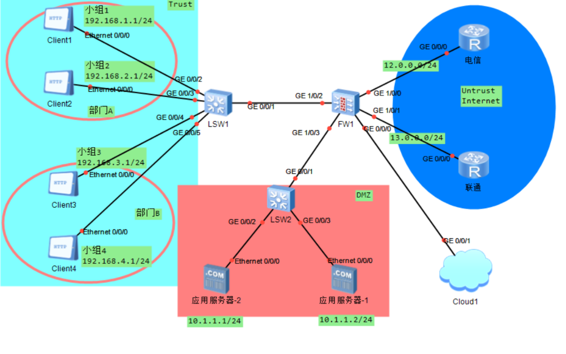 [fw-GigabitEthernet1/0/0]ip address 12.0.0.1 24