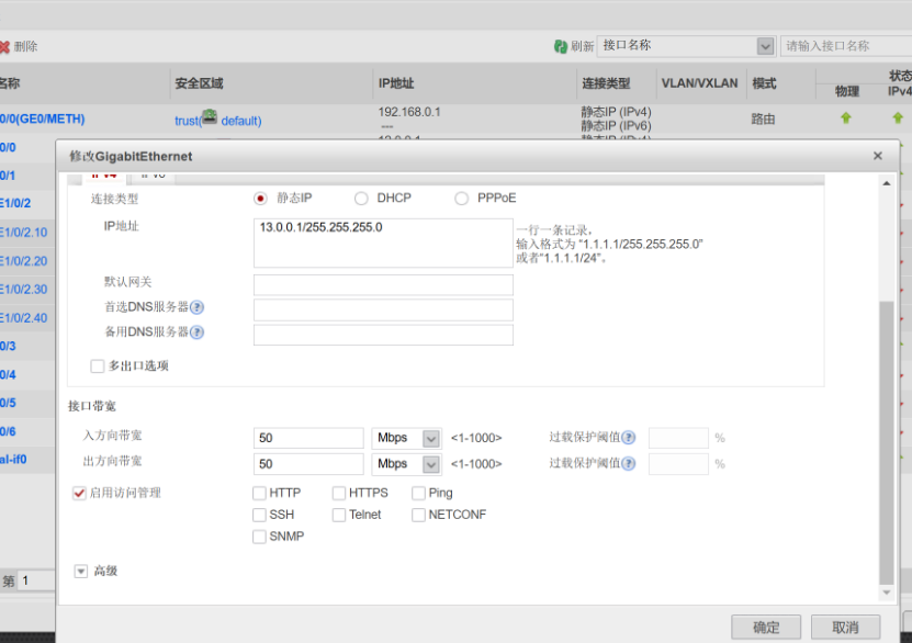 [fw-GigabitEthernet1/0/1]ip address 13.0.0.1 24