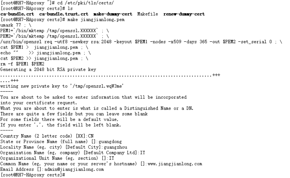 采用客户端到HAProxy使用https、HAProxy到WEB端使用http的方式,只需要在HAProxy上配置证书,这里我们就配置一张自签名证书来测试一下
