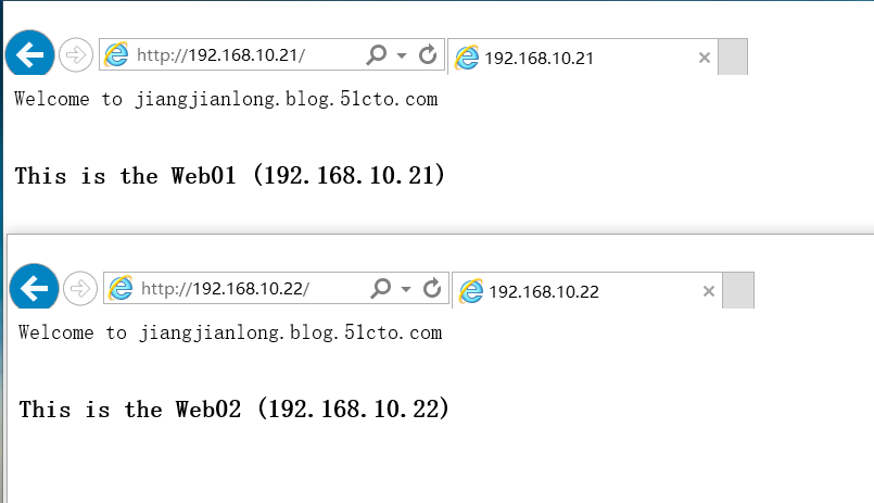1、使用浏览器访问两台web的IP地址,能成功访问到不同的页面,方便我们后面直观地观察负载均衡的效果。由于Apache的安装配置不是本文重点,具体可参考本人之前的博文《RedHat 7安装配置Apache 2.4》