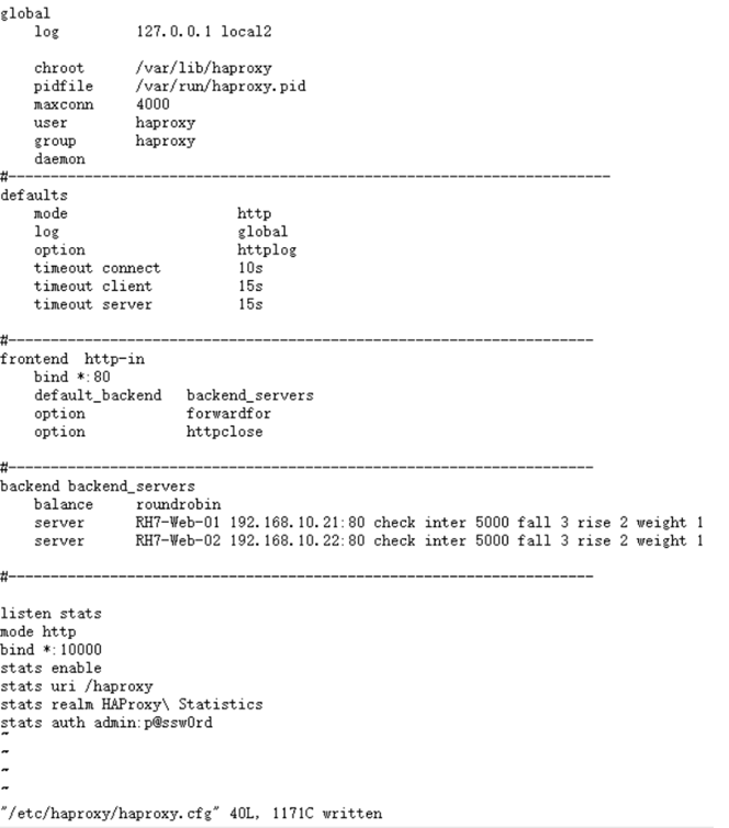 [root@RH7-HAProxy~]yum -y install haproxy [root@RH7-HAProxy~]systemctl start haproxy [root@RH7-HAProxy~]systemctl enable haproxy [root@RH7-HAProxy~]mv /etc/haproxy/haproxy.cfg /etc/haproxy/haproxy.cfg.bak [root@RH7-HAProxy~]vi /etc/haproxy/haproxy.cfg