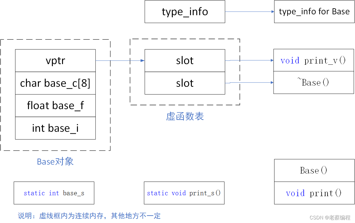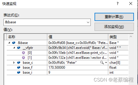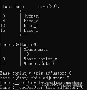 其实这就是对象base的数据布局。从上到下按顺序分别是:虚函数表指针vptr、base_c、base_f和base_i。但是没有base_s变量。