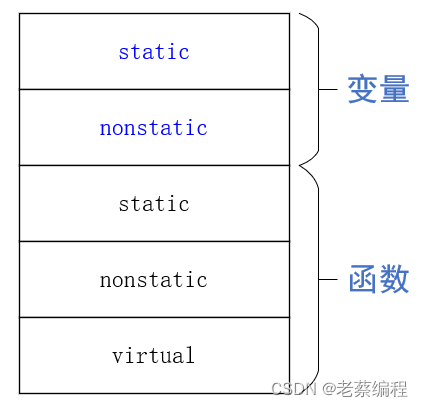 C++的类有2种成员变量:static, nonstatic,3种成员函数:static, nonstatic, virtual。