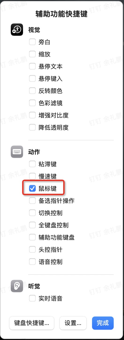 按Cmd + Option + F5调出辅助功能快捷方式菜单,勾选鼠标键选项,按Esc保存更改。之后可用数字键移动光标,I键(或小键盘上的 5 键)复制鼠标单击。然后单击完成即可。