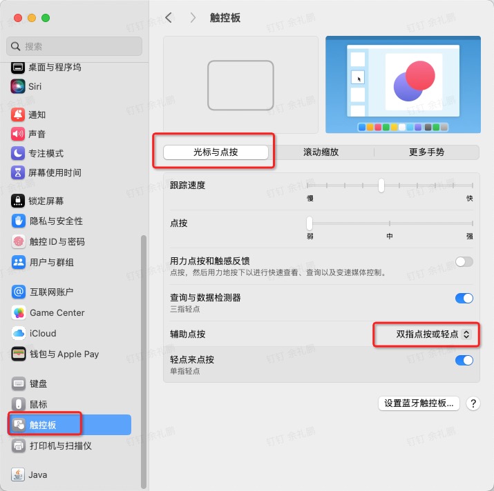 最后确定:系统设置->触控板->光标与点按->辅助点按->双指点按或轻点,是选中的即可