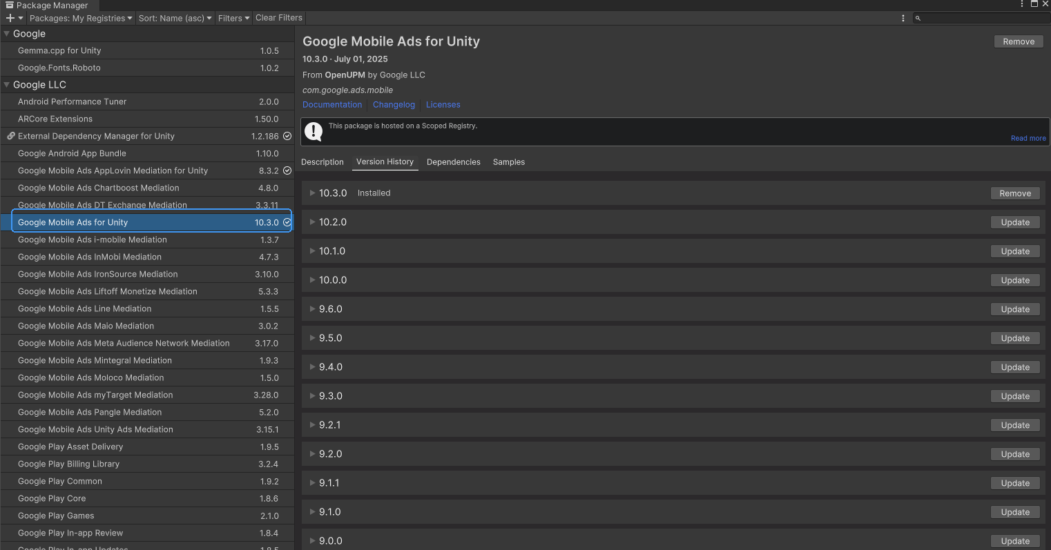 1.unity2022.3通过UPM导入Google Mobile Ads AppLovin Mediation for Unity 后报错:Library\PackageCache\com.google.ads.mobile@10.0.0\GoogleMobileAds\Editor\GradleProcessor.cs(54,18): error CS0122: 'GoogleMobileAdsSettings' is inaccessible due to its protection level