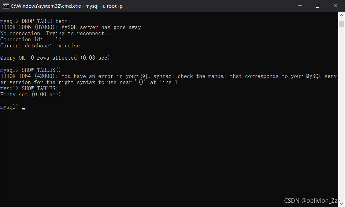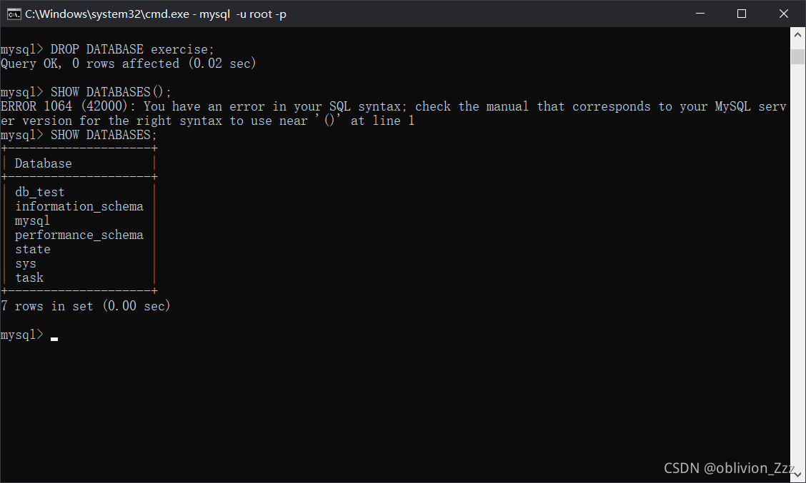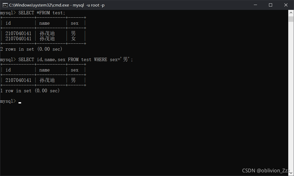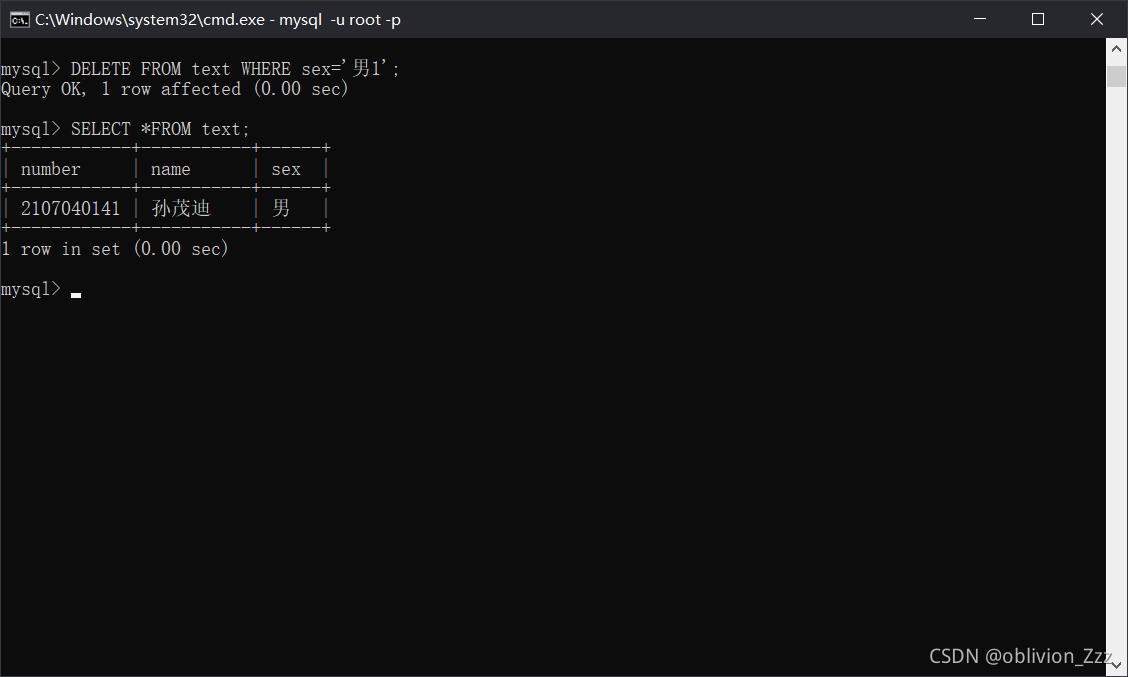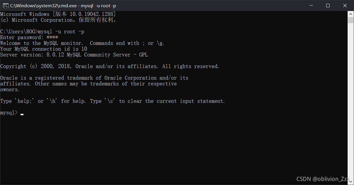2.打开cmd,输入mysql -u root -p<CR>root,登录MySQL。