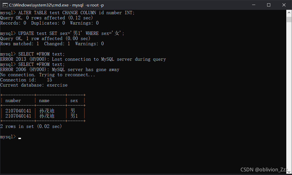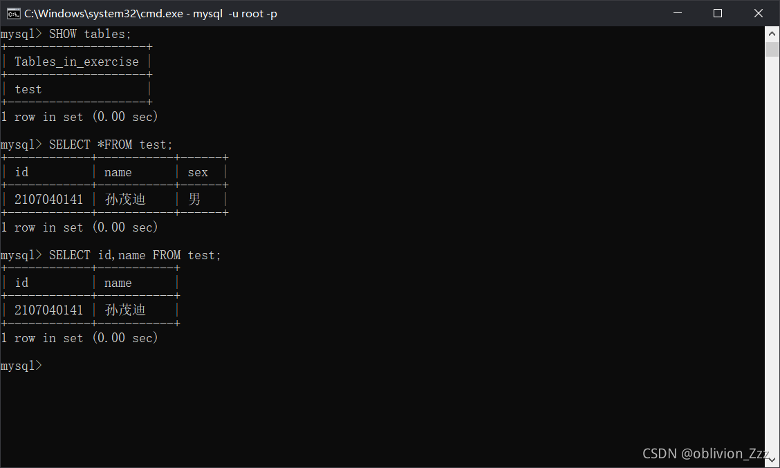 5.对exercise数据库中的表及表中字段进行查询。