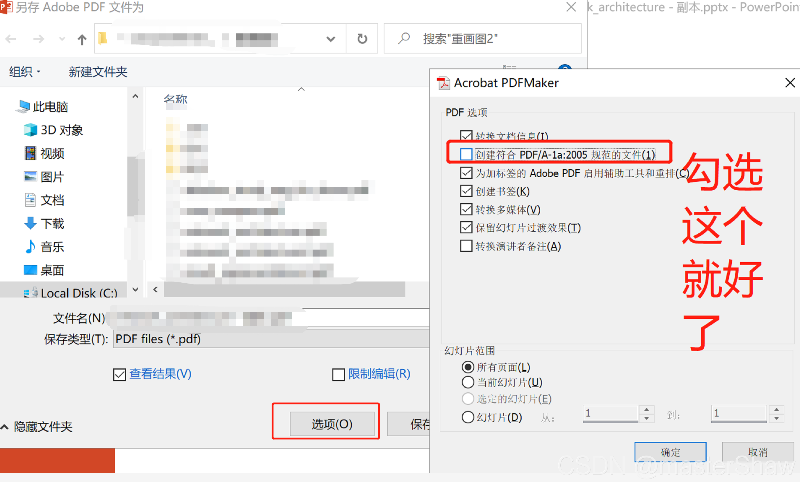 2. 如果选了【蓝色】,还有transparency group 或者 soft mask问题。则点击【选项】,勾选红色框的地方即可