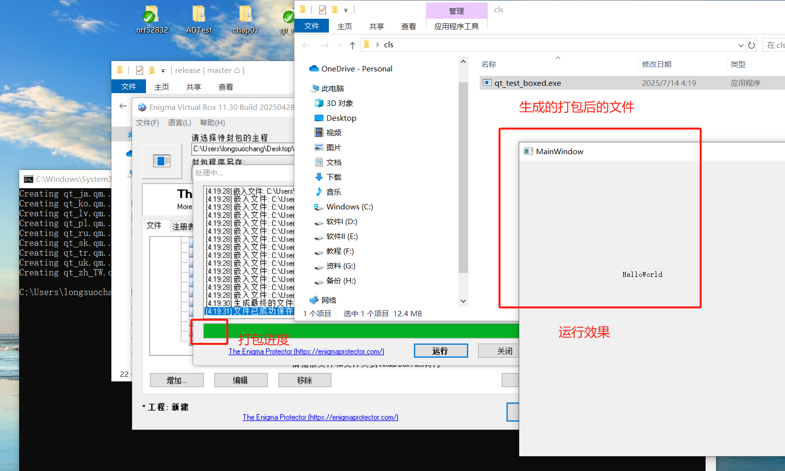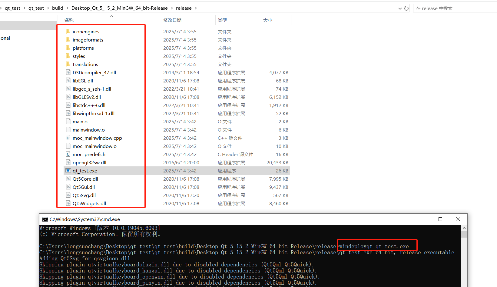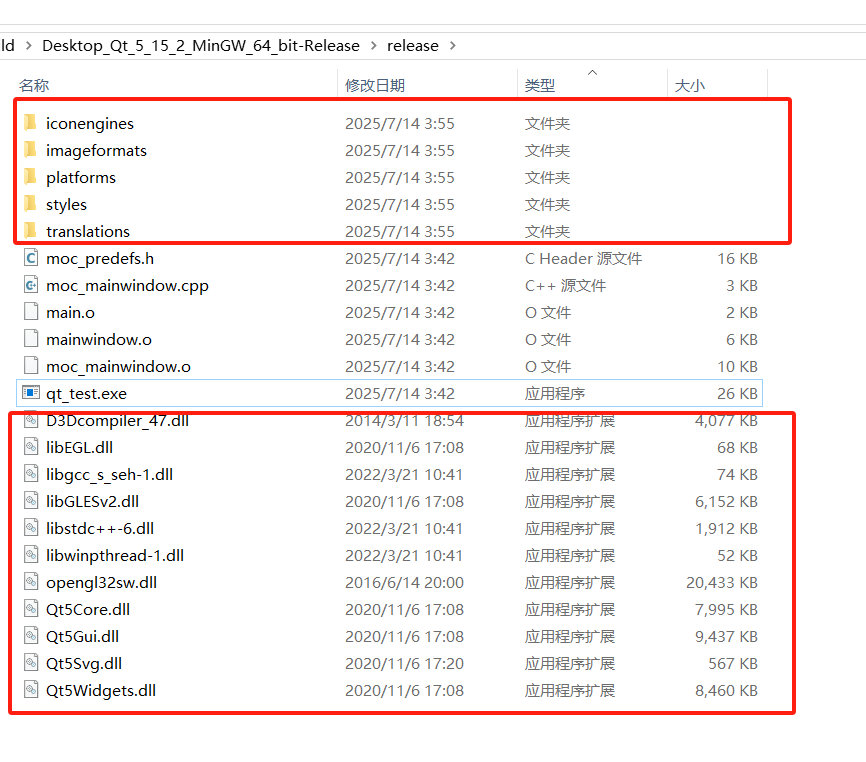 命令具体为 windeployqt qt_test.exe ,观察生成的文件可知红色方框内为生成的所需的依赖