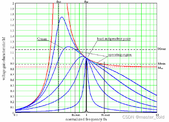 其中红色曲线为空载时(Q=0)的电压增益曲线MOL,随着fn趋向于无穷,MOL逐渐趋向于M∞。