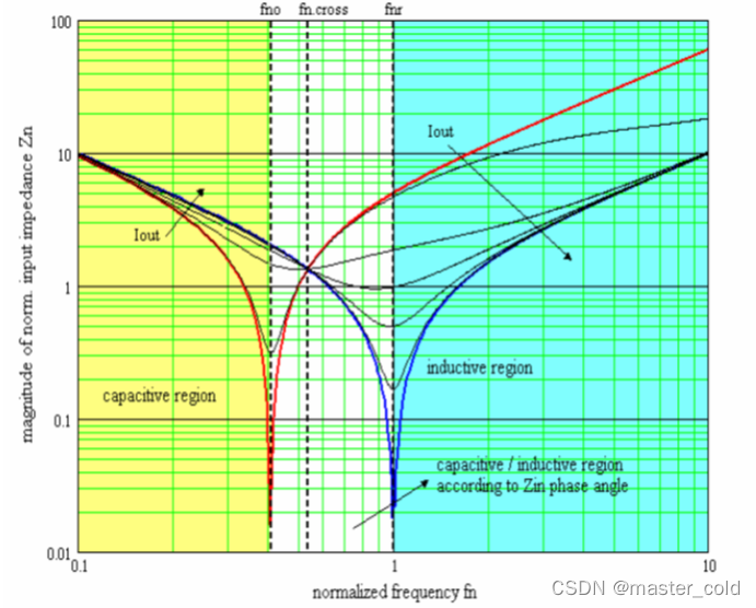 从图中可以看到,对于不同的Q值曲线,都会经过Load-independent point(fr,unity gain),且该点所有曲线的切线斜率-2λ。很幸运,load-independent point出现在电压增益特征曲线的感性区域,这里谐振腔电流滞后于输入电压方波(这个是ZVS的必要条件)。