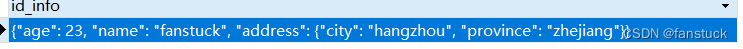 INSERT INTO mytable5 (id_info) VALUES ('{"name":"fanstuck", "age":23, "address":{"province":"zhejiang", "city":"hangzhou"}}');