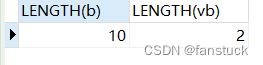 可以看到,b字段数据的长度为10,vb字段的数据长度为2。说明BINARY类型的字段长度为固定值,为定义字段时指定的字段长度,而VARBINARY类型的字段长度的值是可变的。