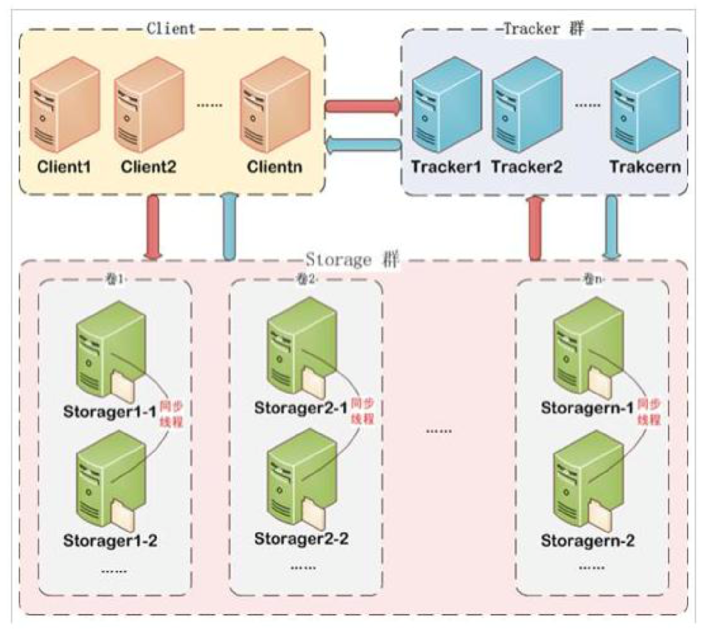 FastDFS 架构包括 Tracker server 和 Storage server。客户端请求 Tracker server 进行文 件上传、下载,通过 Trackerserver 调度最终由 Storage server 完成文件上传和下载。