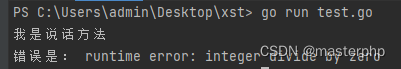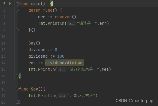 结果显而易见:报错了,获取的结果没有输出,后续Say函数也不执行了,如果需要执行后续Say函数,就需要用到GoLang的错误捕获机制。