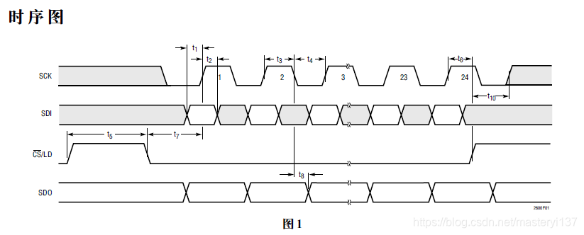 通过这张时序图,可以看出LTC2600的读写逻辑,和其他SPI读写大同小异。片选为低时才能发送数据,SDI在时钟SCK的上升沿发送数据。