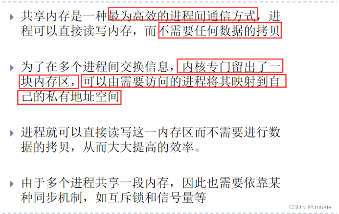 对于共享内存机制来说,仅在建立共享内存区域时需要系统调用,一旦建立共享内存,所有的访问都可作为常规内存访问,无需借助内核。这样,数据就不需要在进程之间来回拷贝,所以这是最快的一种进程通信方式。