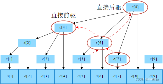 直接前驱:c[i]c[i]c[i]的直接前驱为c[i−lowbit(i)]c[i -lowbit(i)]c[i−lowbit(i)],即c[i]c[i]c[i]左侧紧邻的子树的根。