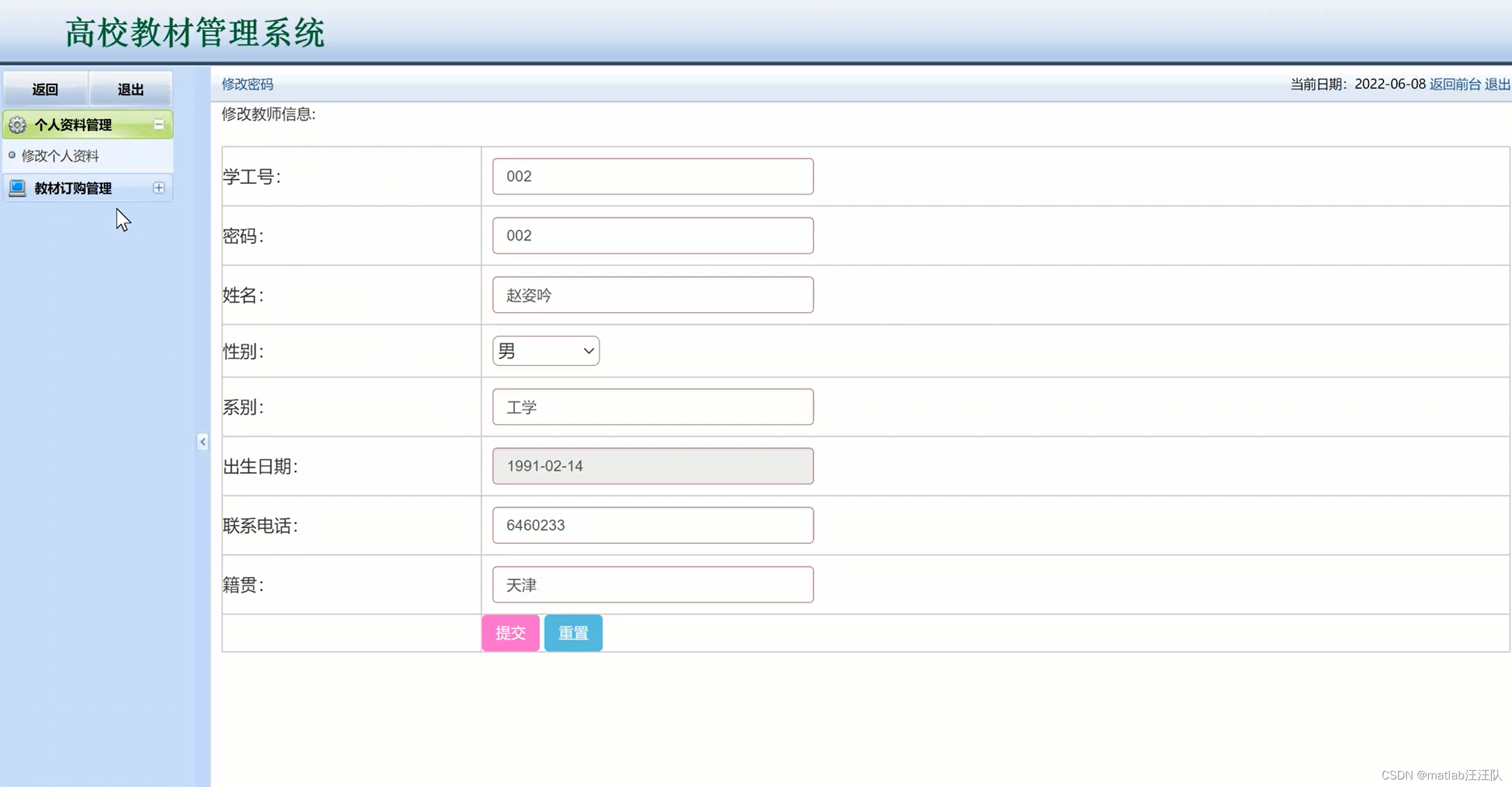 查看提交的教材订单,学生角色登陆,修改个人资料等功能。