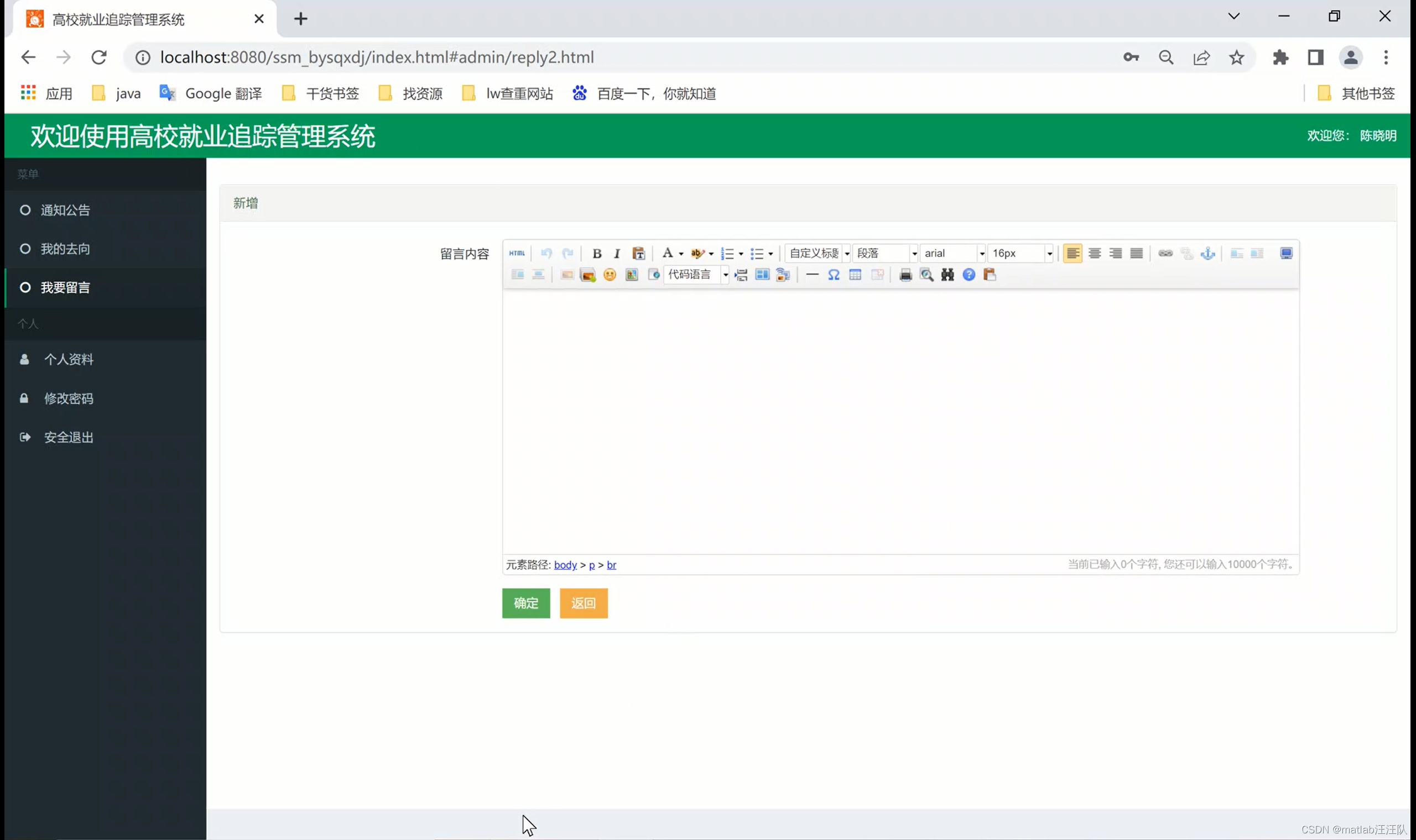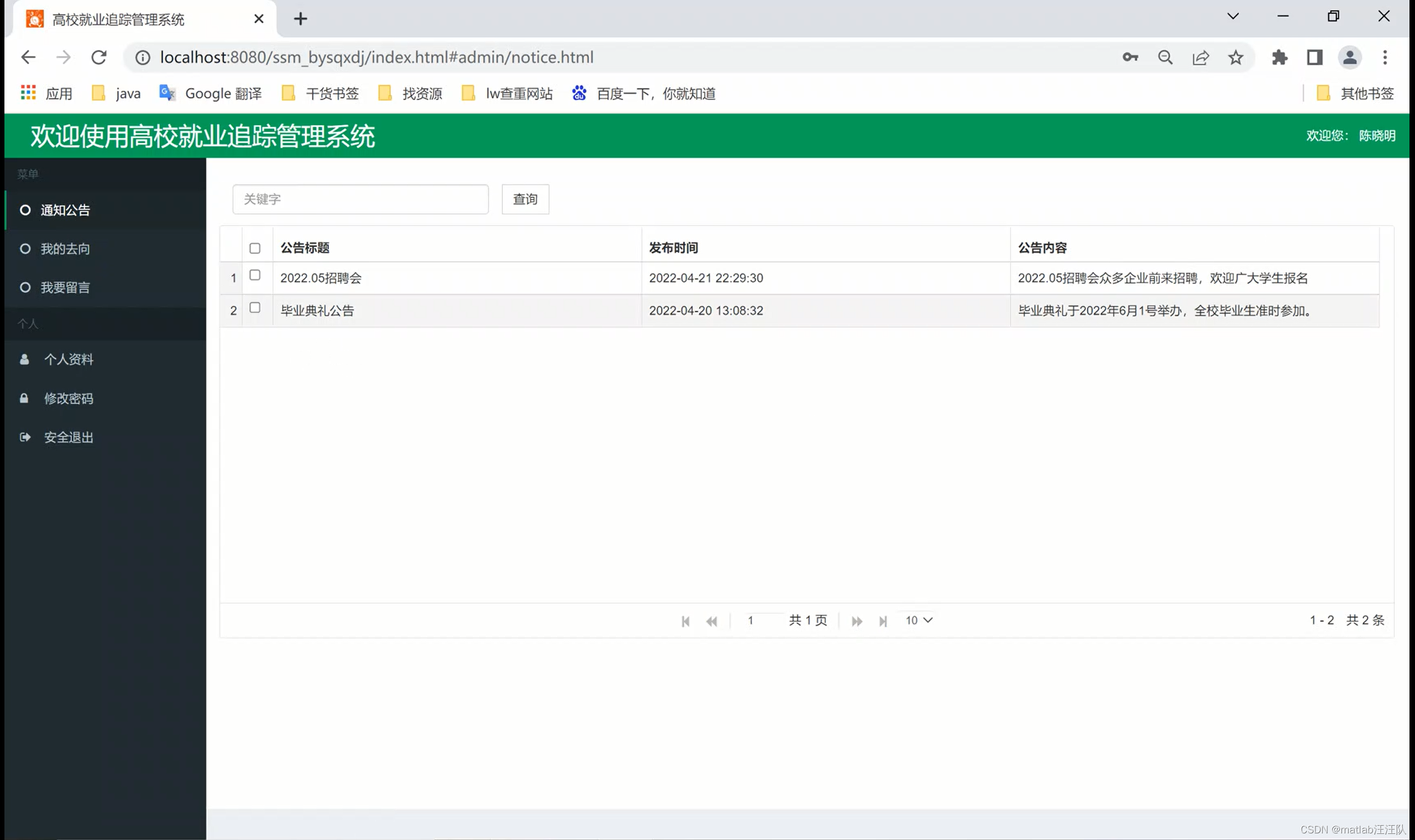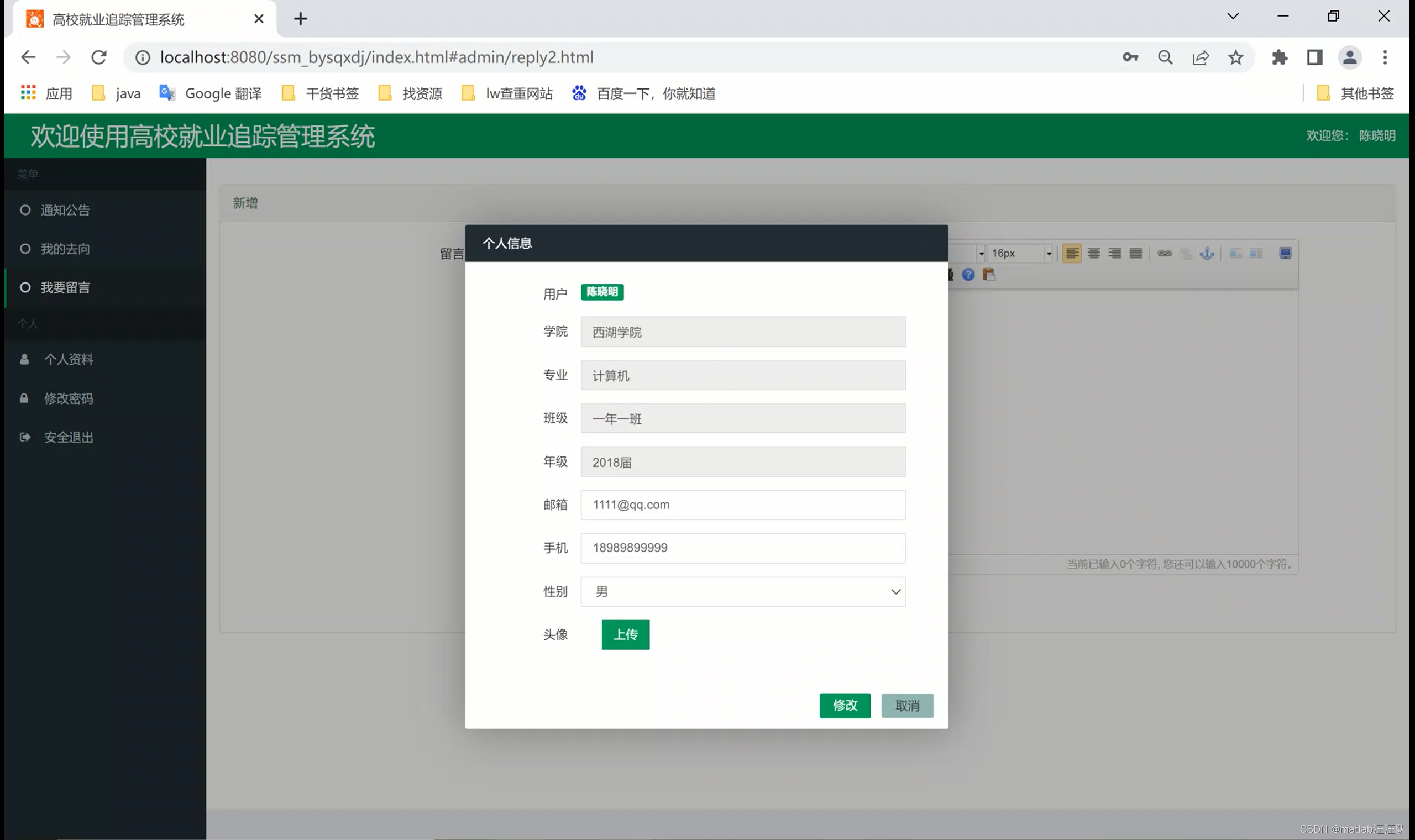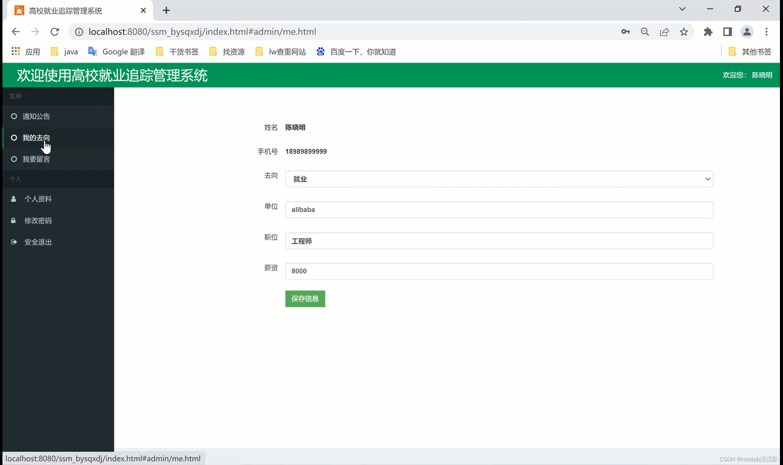学生功能:学生登录,查看通知公告,管理我的去向,留言管理,修改个人资料,修改密码等功能。