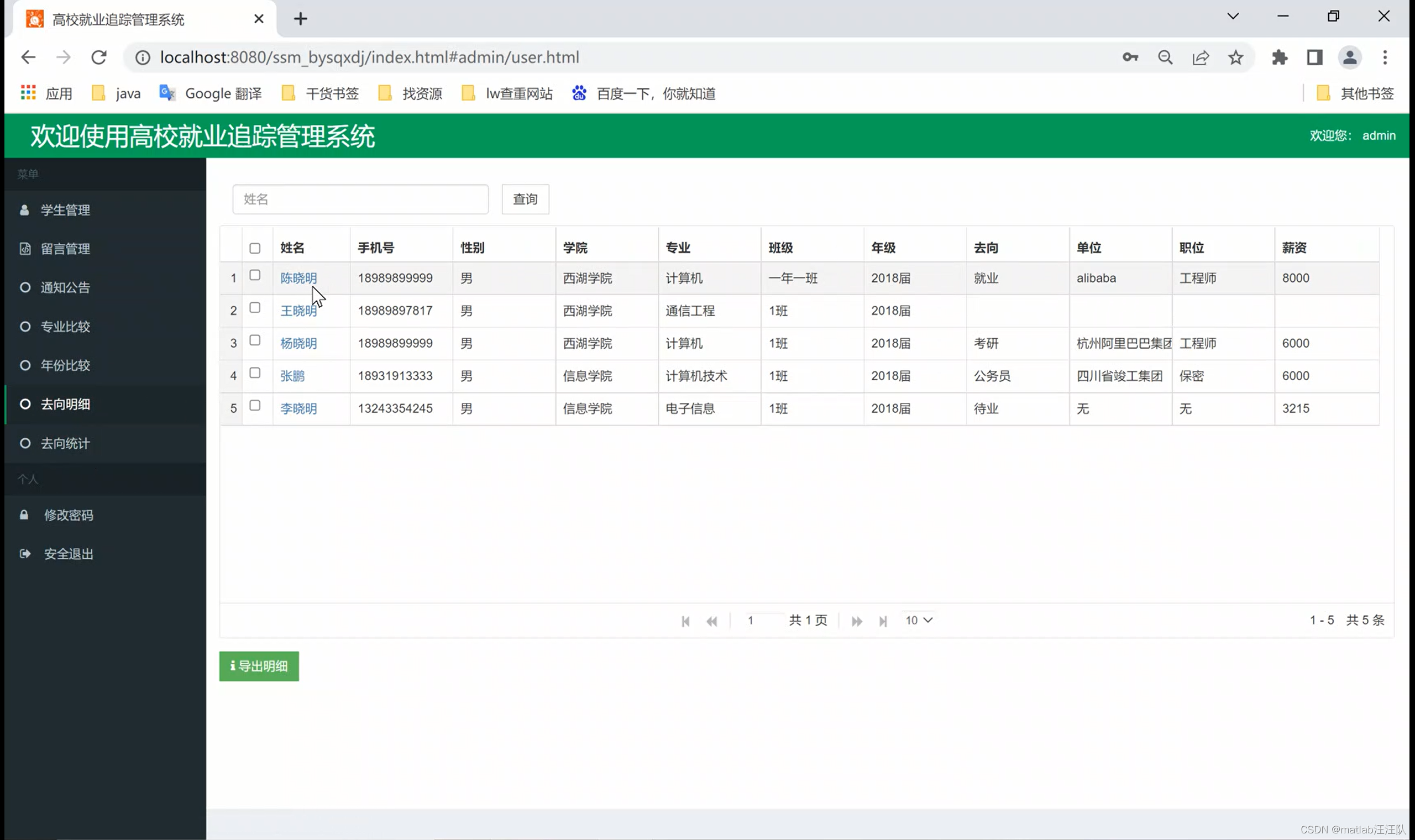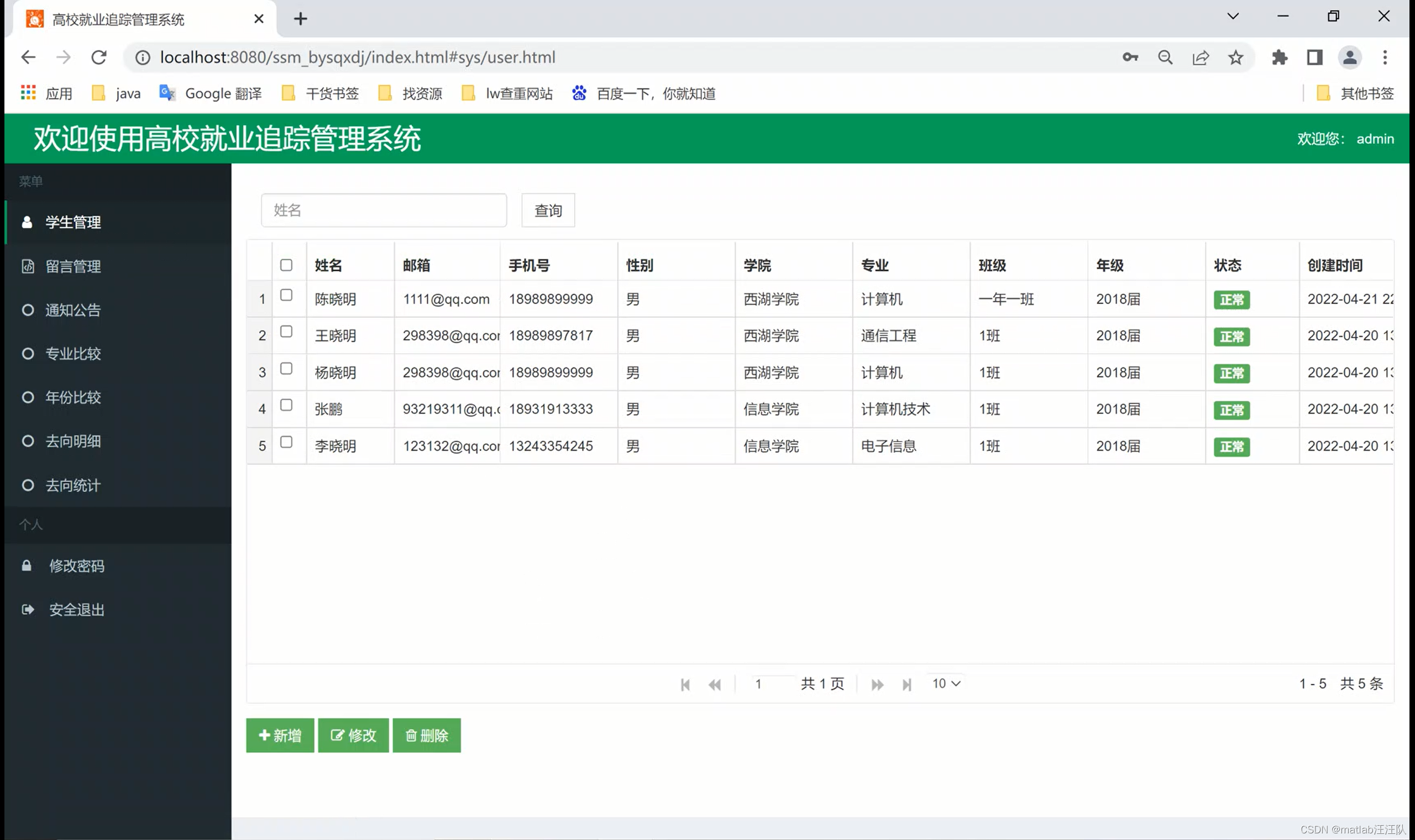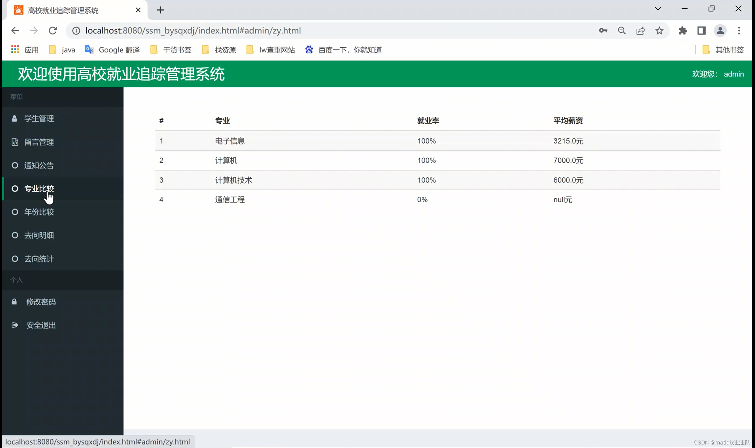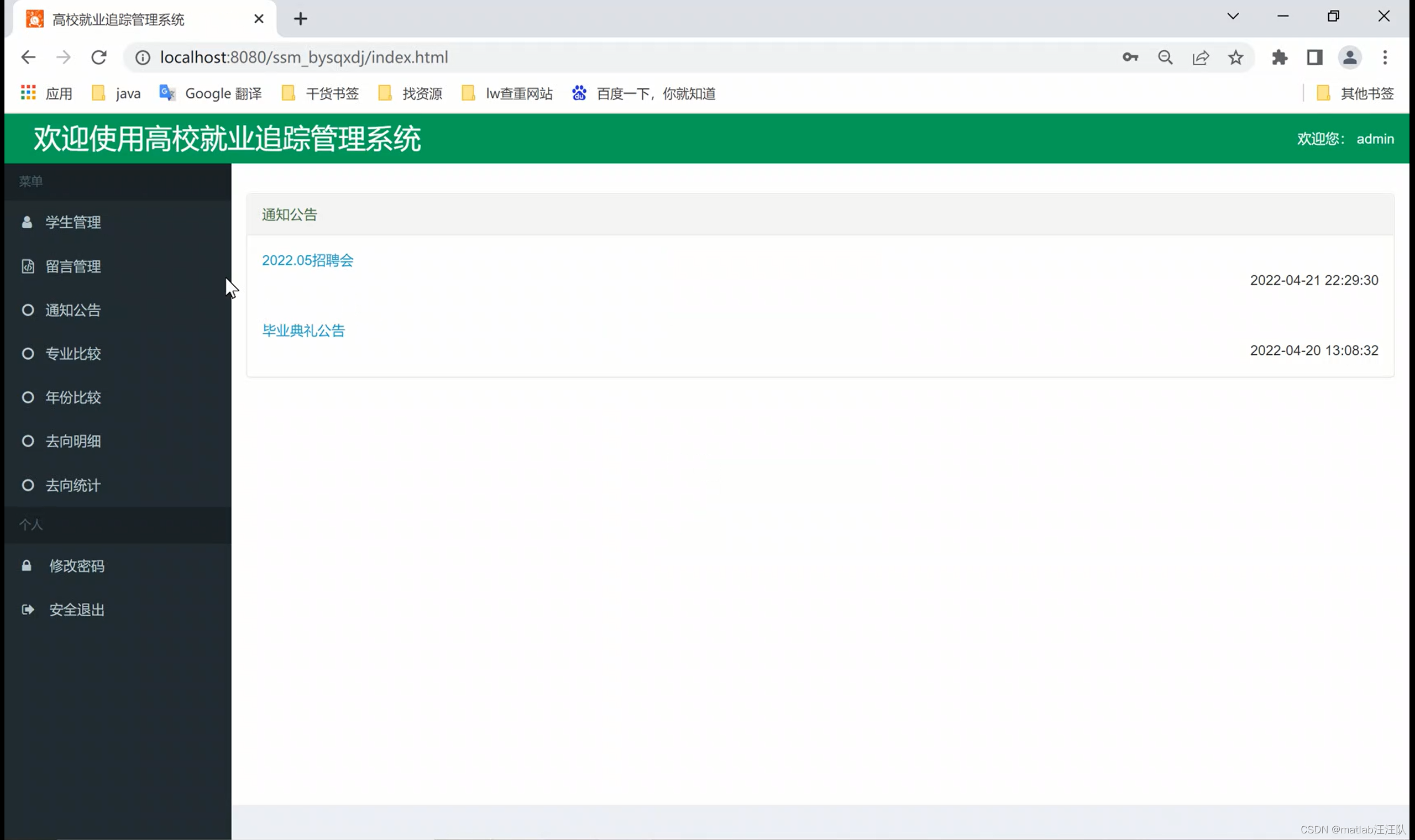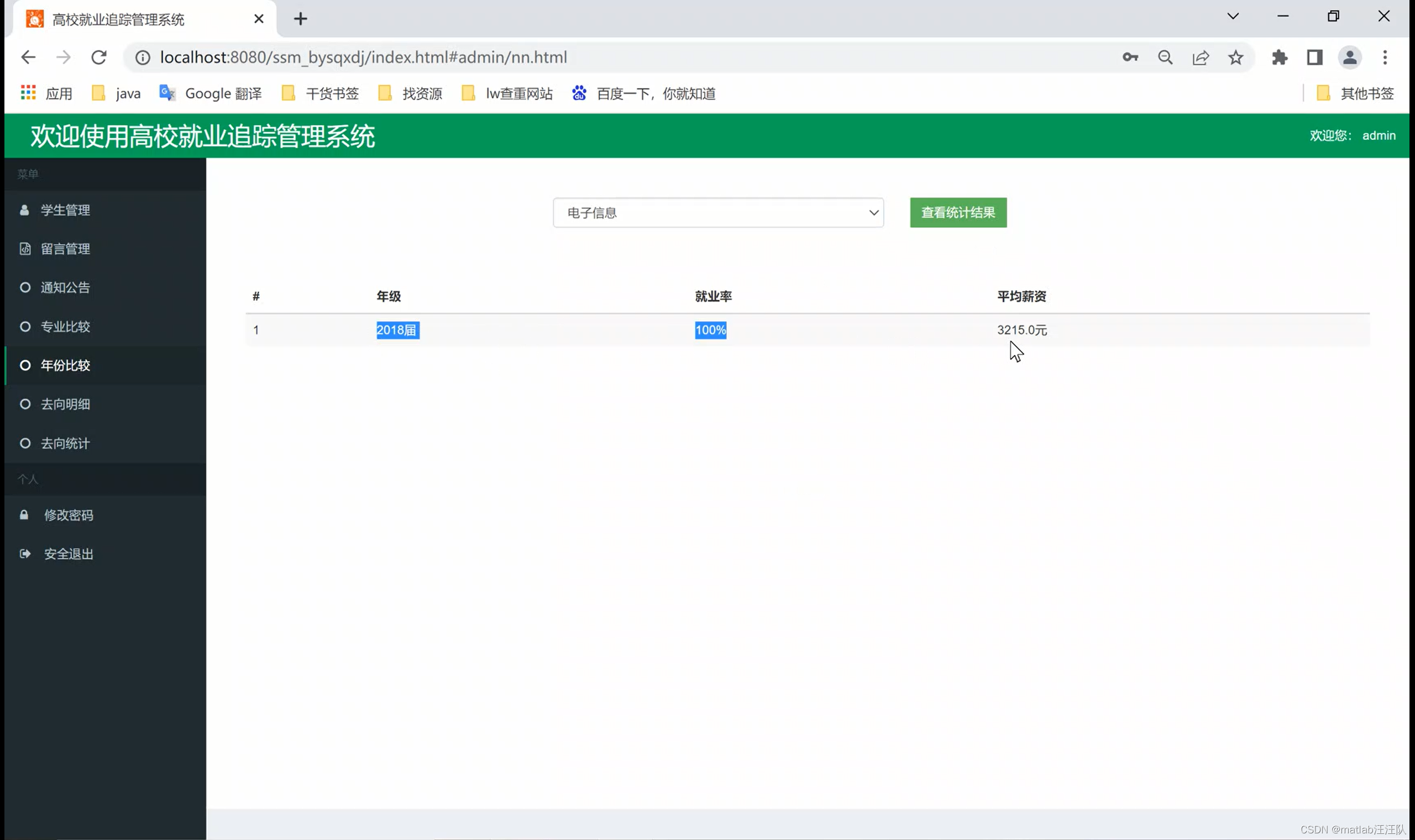 管理员功能:管理员登录,学生增删改查管理,留言增删改查管理,通知公告管理,查看专业比较,查看年份比较,