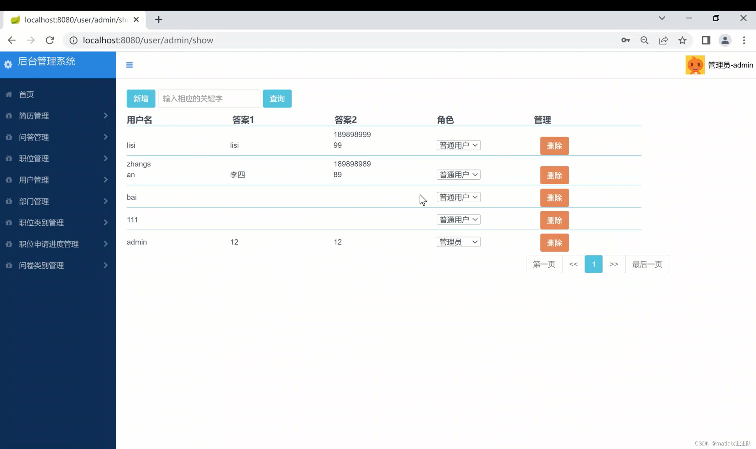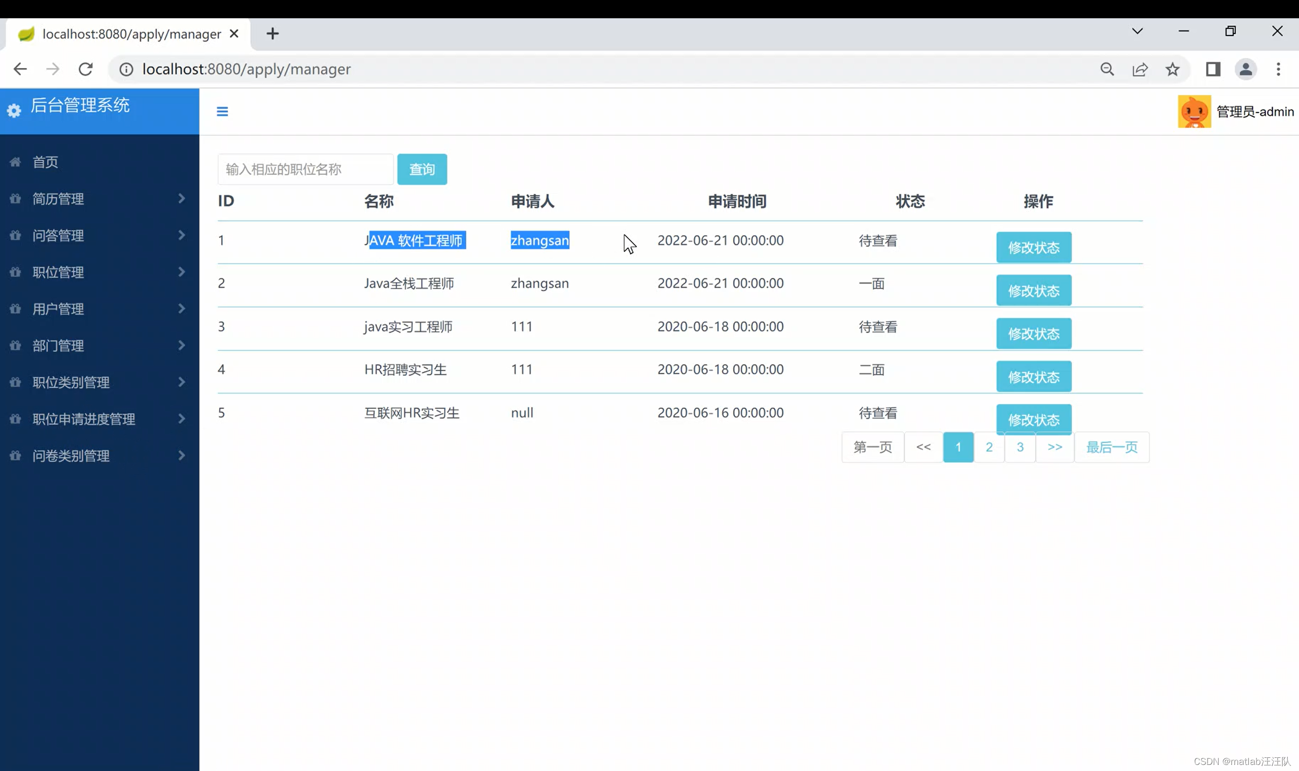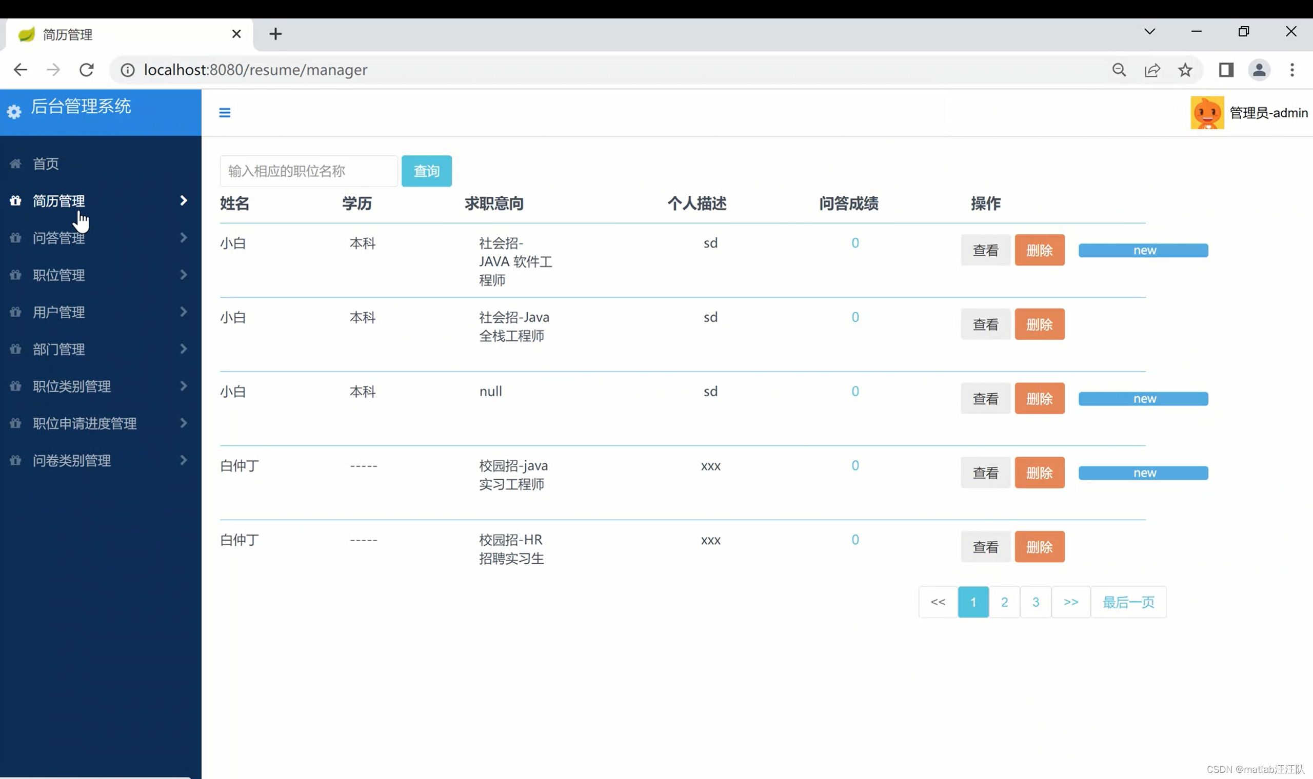 管理员:简历管理,问答管理,职位管理,用户管理,部分管理, 职位类别管理,职位申请进度管理, 问卷类别管理。