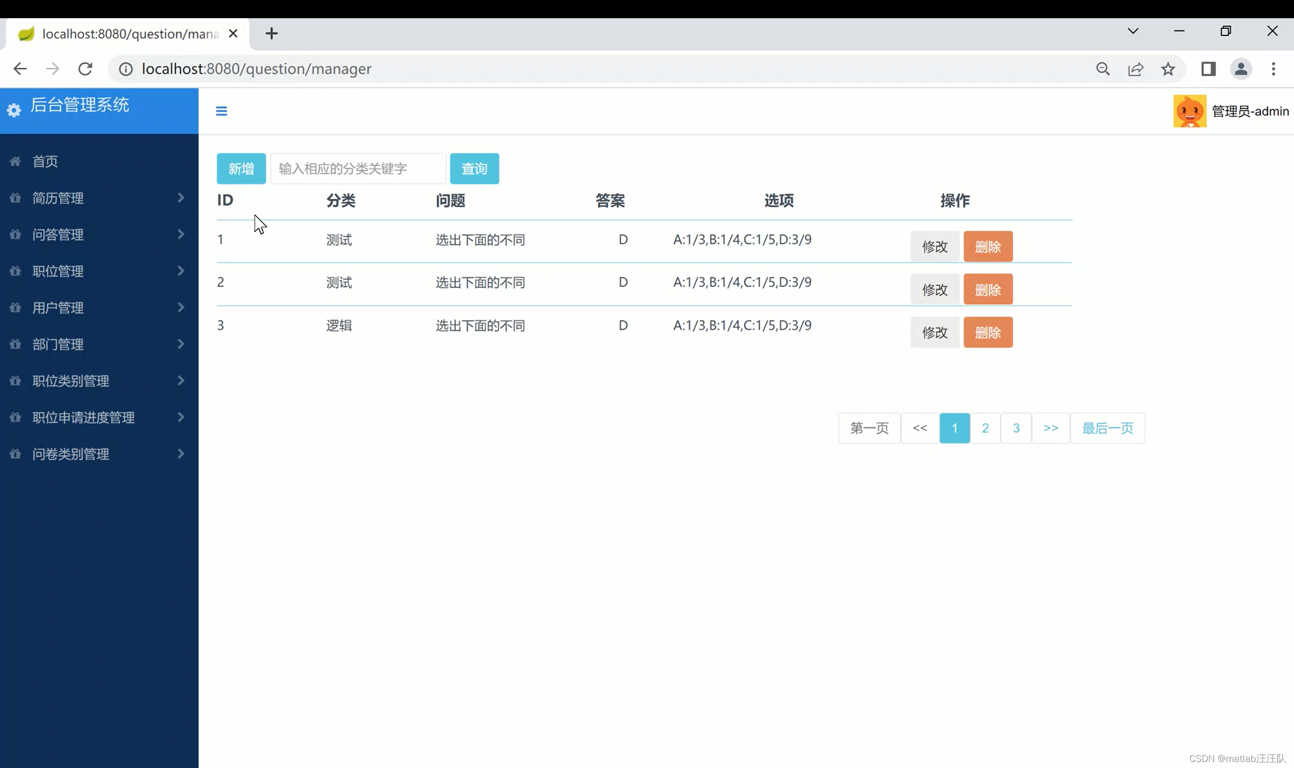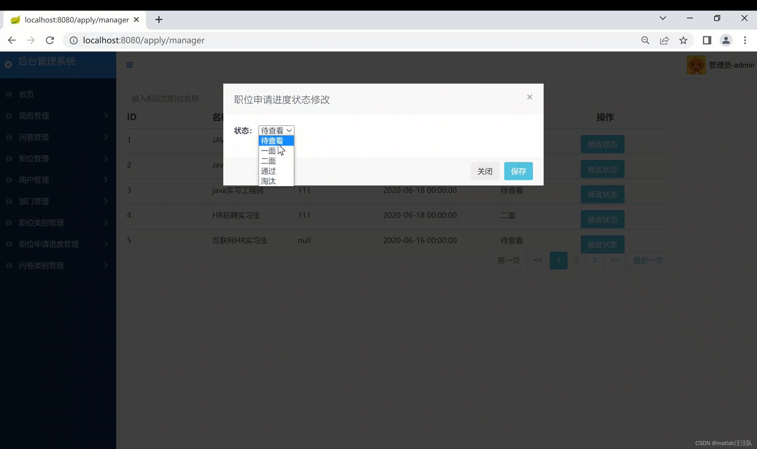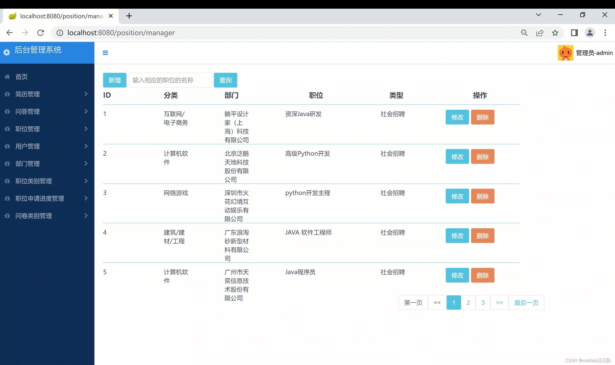 管理员:简历管理,问答管理,职位管理,用户管理,部分管理, 职位类别管理,职位申请进度管理, 问卷类别管理。