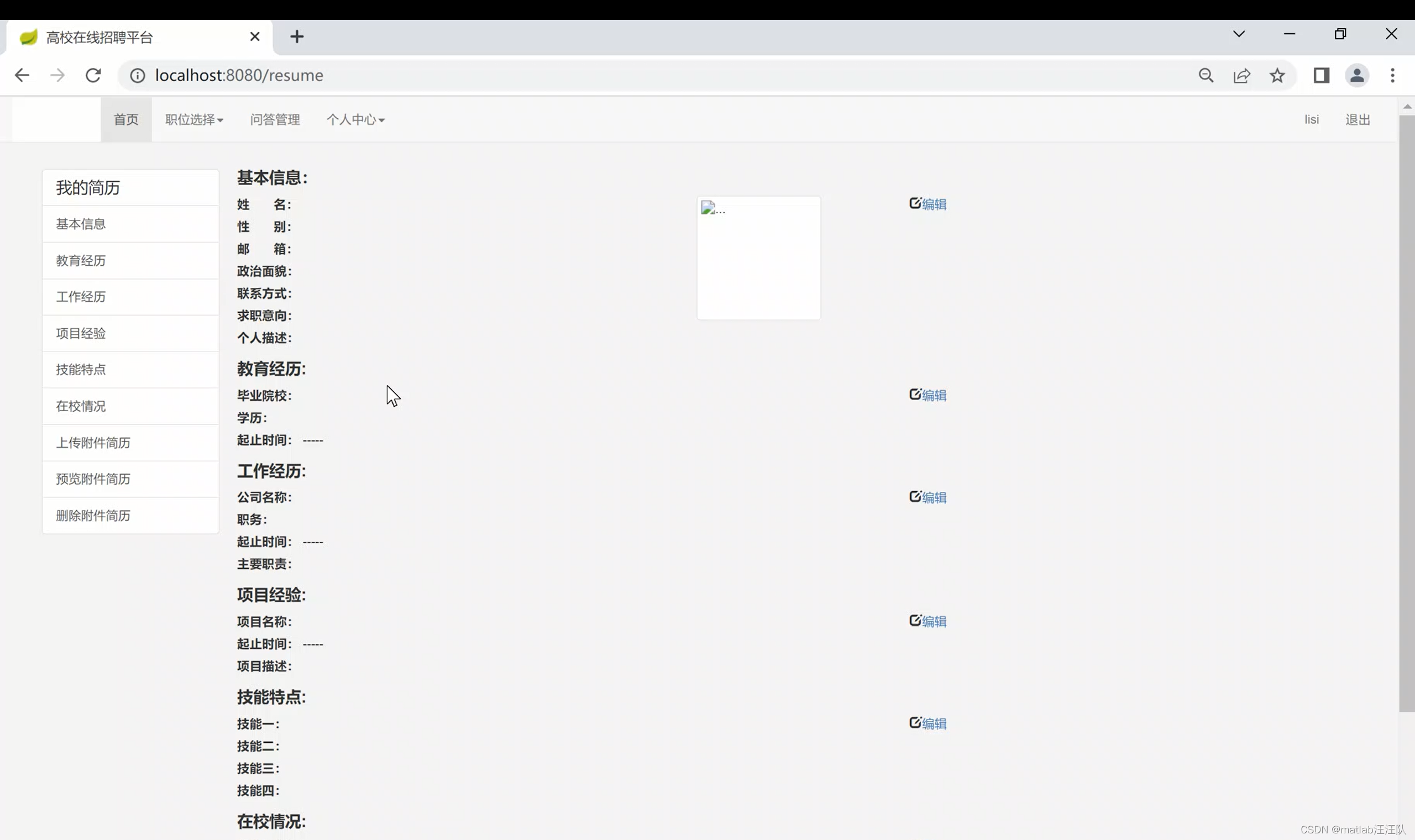 用户:注册登陆,在线搜索简历,申请岗位,收藏中心,进度查看,问卷测试,个人中心,简历管理等功能