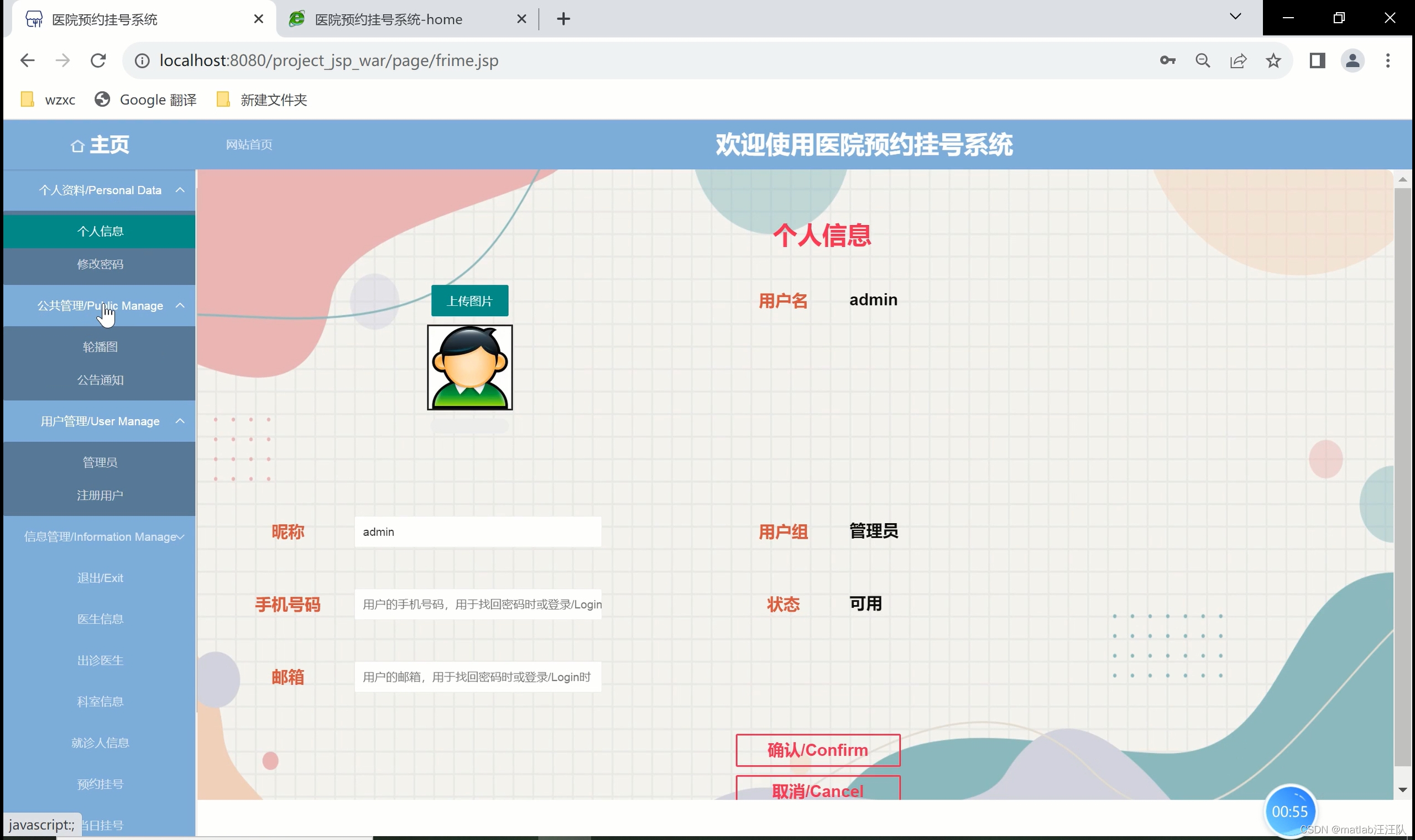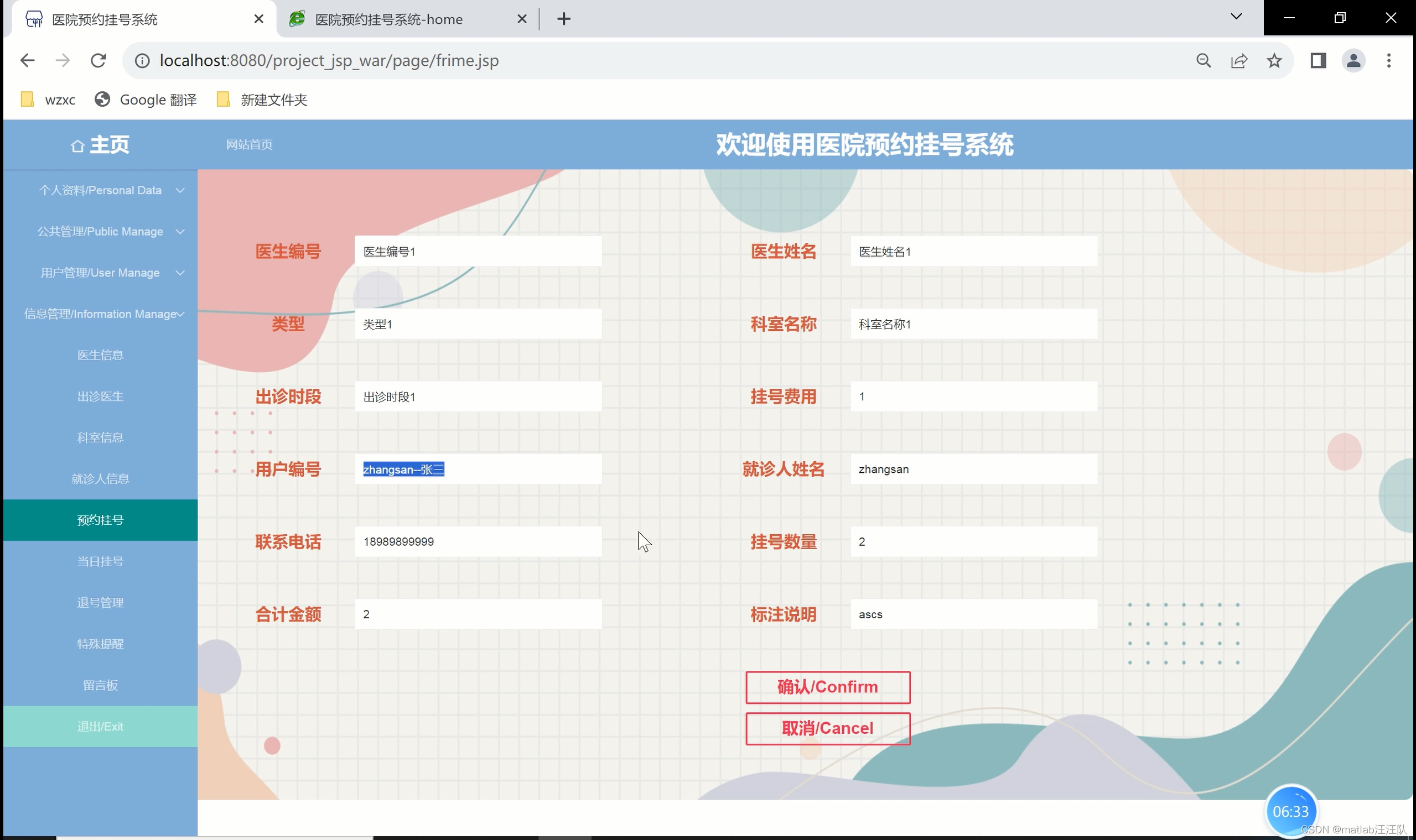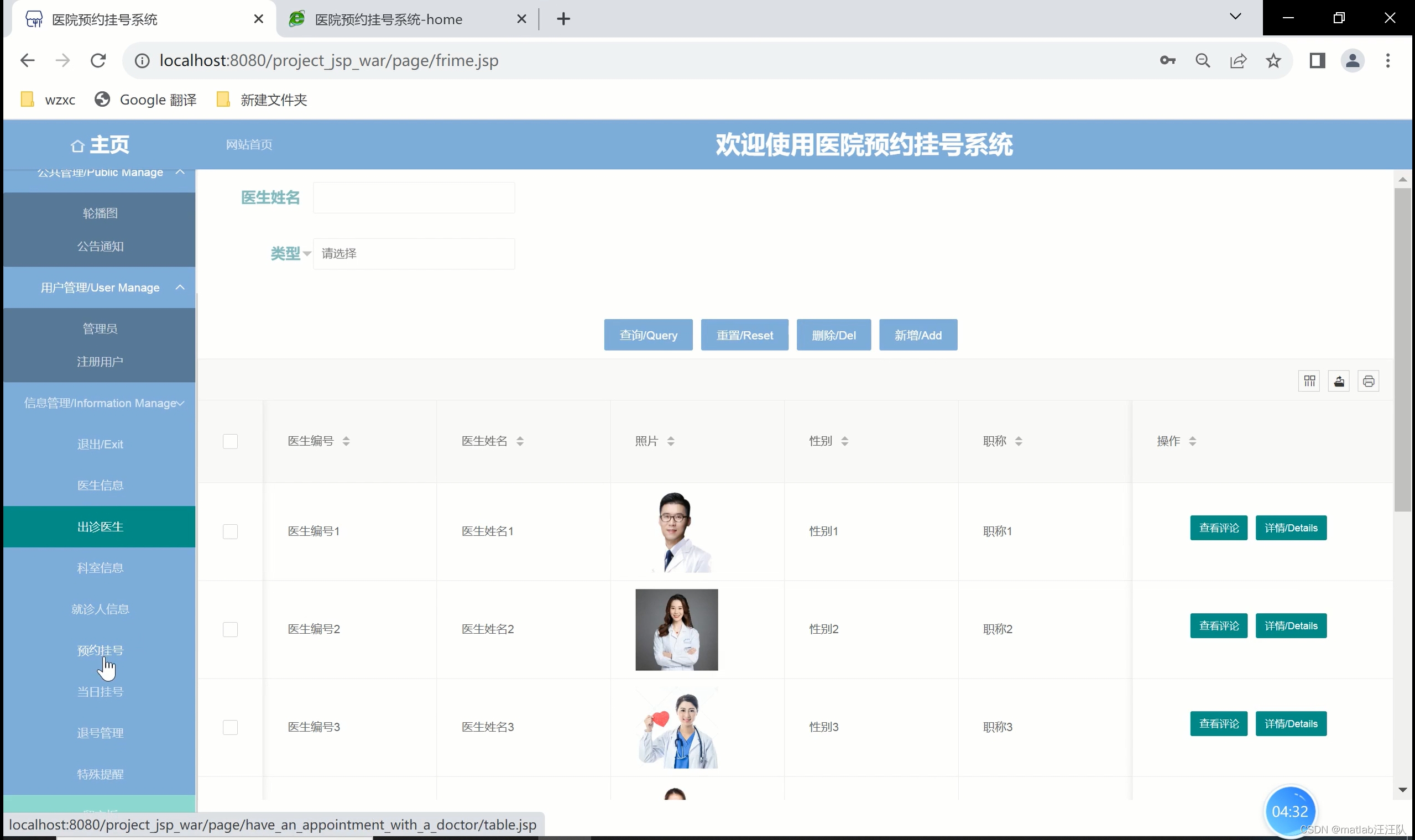 主要实现医院介绍、用户管理、医生信息、出诊医生、预约挂号、科室信息、就诊人信息、当日挂号、