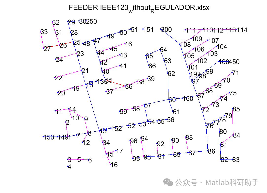 IEEE123节点系统是一个广泛用于配电系统研究的标准测试系统,它包含了各种典型的配电元件,例如:线路、变压器、电容器、负荷等,能够有效评估潮流算法的性能。