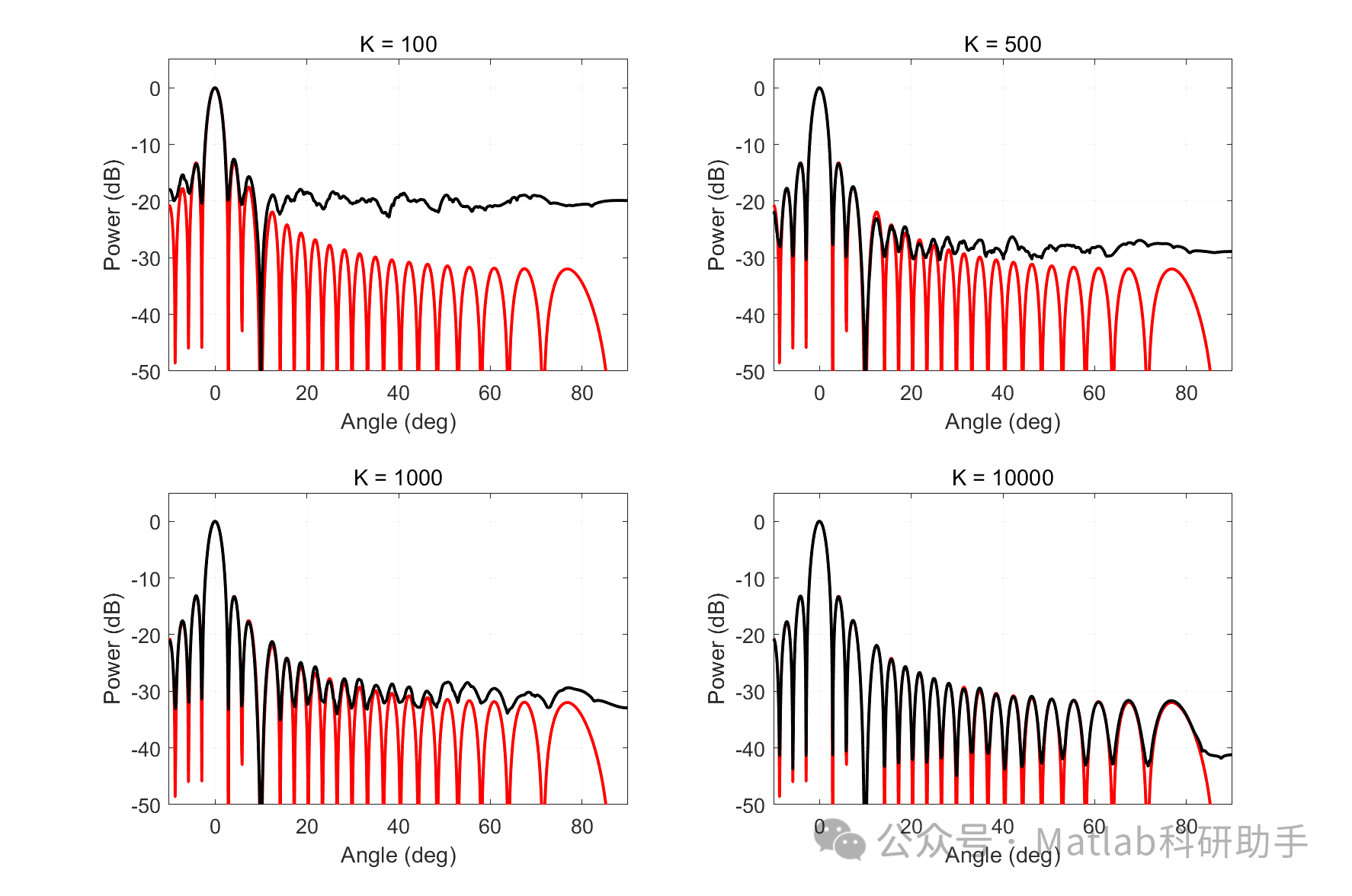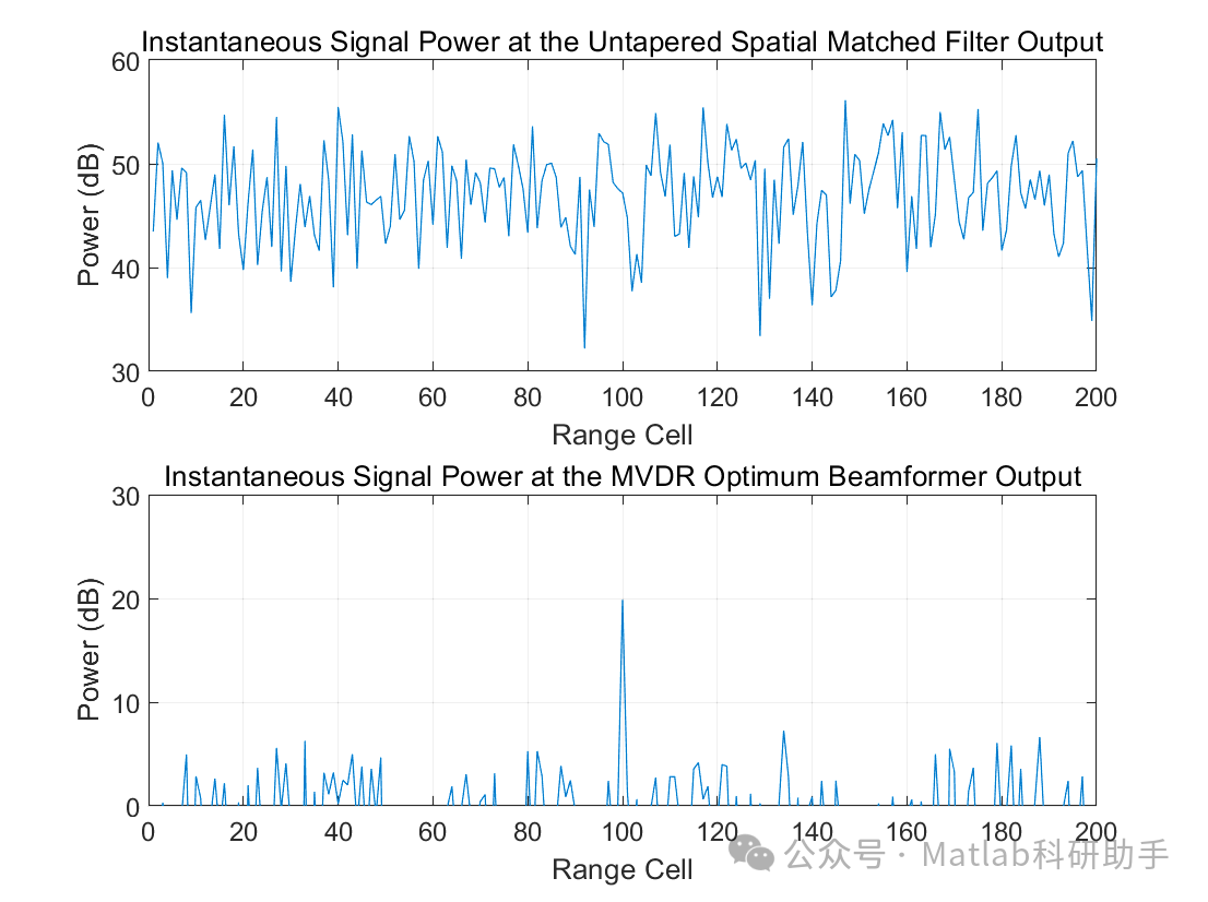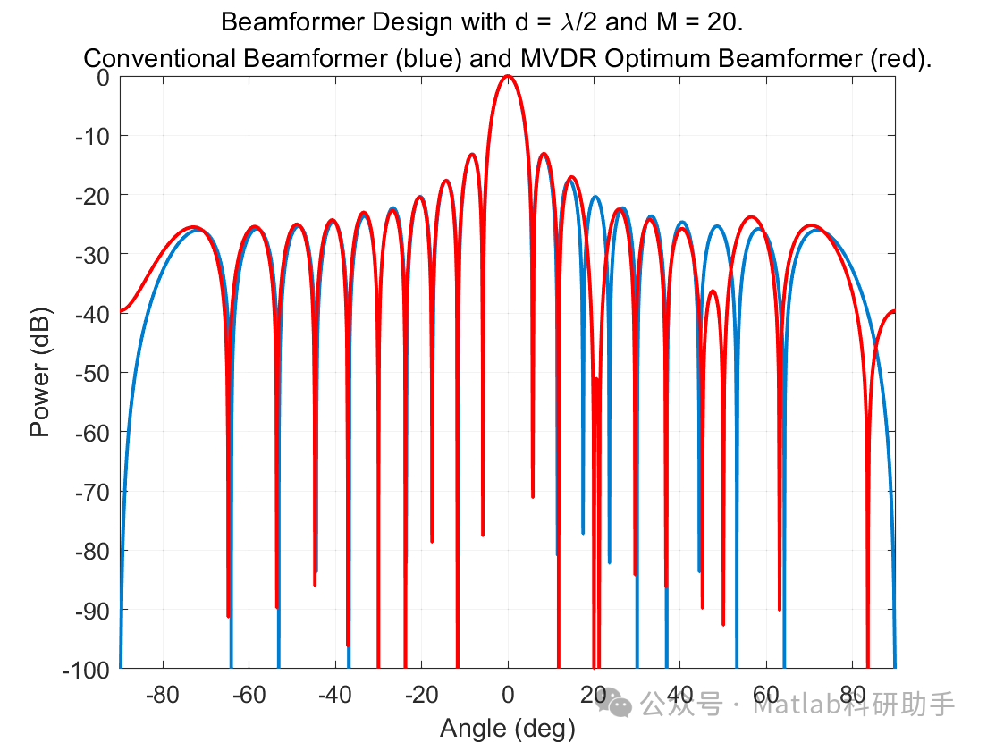 MVDR波束成形器能够有效地抑制强干扰,即使干扰功率远大于目标信号功率。其性能主要取决于对协方差矩阵的估计精度以及目标方向信息的准确性。在存在强干扰的情况下,MVDR的输出信噪比通常远高于空间匹配滤波器。然而,MVDR对目标方向的误差非常敏感。如果目标方向估计不准确,可能会导致主瓣偏离,甚至在目标方向形成零陷,从而严重恶化性能。此外,协方差矩阵的求逆计算复杂度较高,尤其对于大规模阵列。