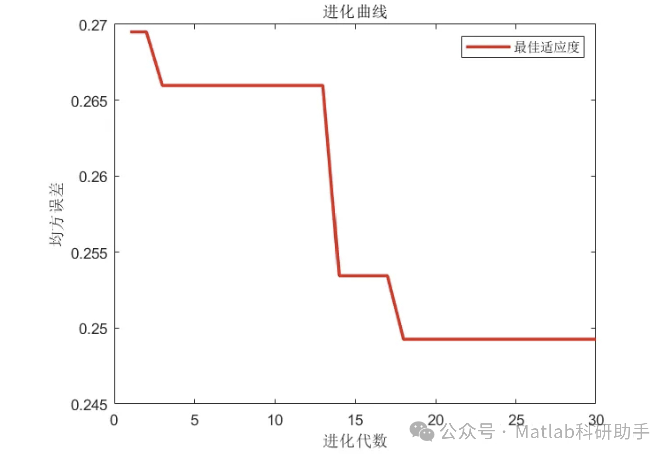 计算每个个体的适应度值。在BP神经网络优化问题中,适应度函数通常是BP神经网络在训练集上的预测误差,如均方根误差(RMSE)或平均绝对误差(MAE)。适应度值越小,表示对应的权值和阈值越优。
