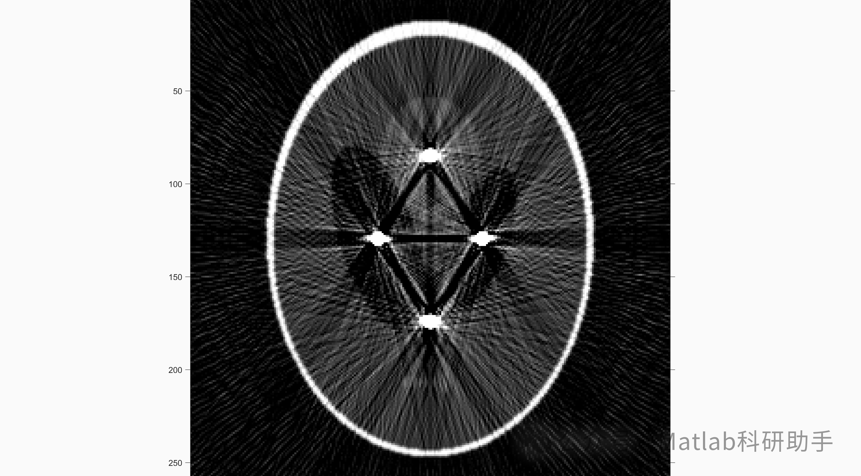 获取模拟的投影数据后,需要利用CT重建算法将投影数据还原为物体的横截面图像。平行束CT常用的重建算法包括滤波反投影(Filtered Backprojection,FBP)和迭代重建算法。