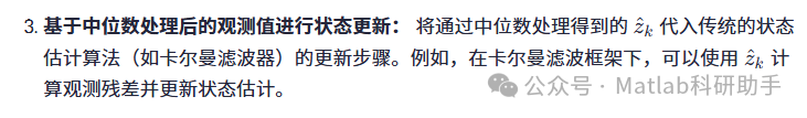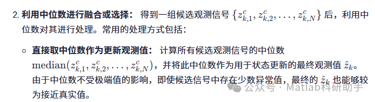 该方法的核心思想在于不依赖单一的观测值进行状态更新,而是考虑由当前观测值生成的多个候选观测信号。然后,通过中位数对这些候选观测信号进行融合或选择,从而抑制异常值的影响。其基本流程可以概括如下: