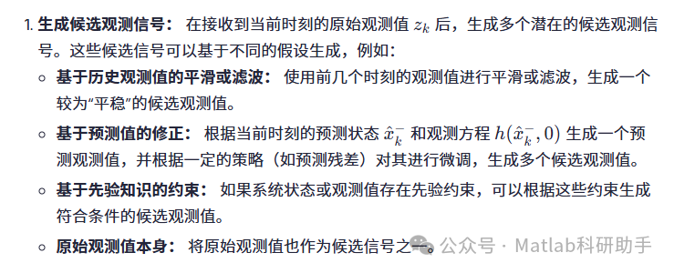 生成候选观测信号的具体策略取决于应用场景和对异常值特性的了解。目标是生成一组能够代表当前时刻潜在真实观测值的集合,其中包含真实值、受噪声污染的正常值以及可能存在的异常值。