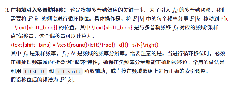 模拟信号的采样频率 fsfs 必须足够高,以满足奈奎斯特采样定理,避免混叠。同时,FFT点数 NN 决定了频域分辨率,更高的 NN 意味着更精细的频率分辨率,从而可以更精确地模拟多普勒频移。
